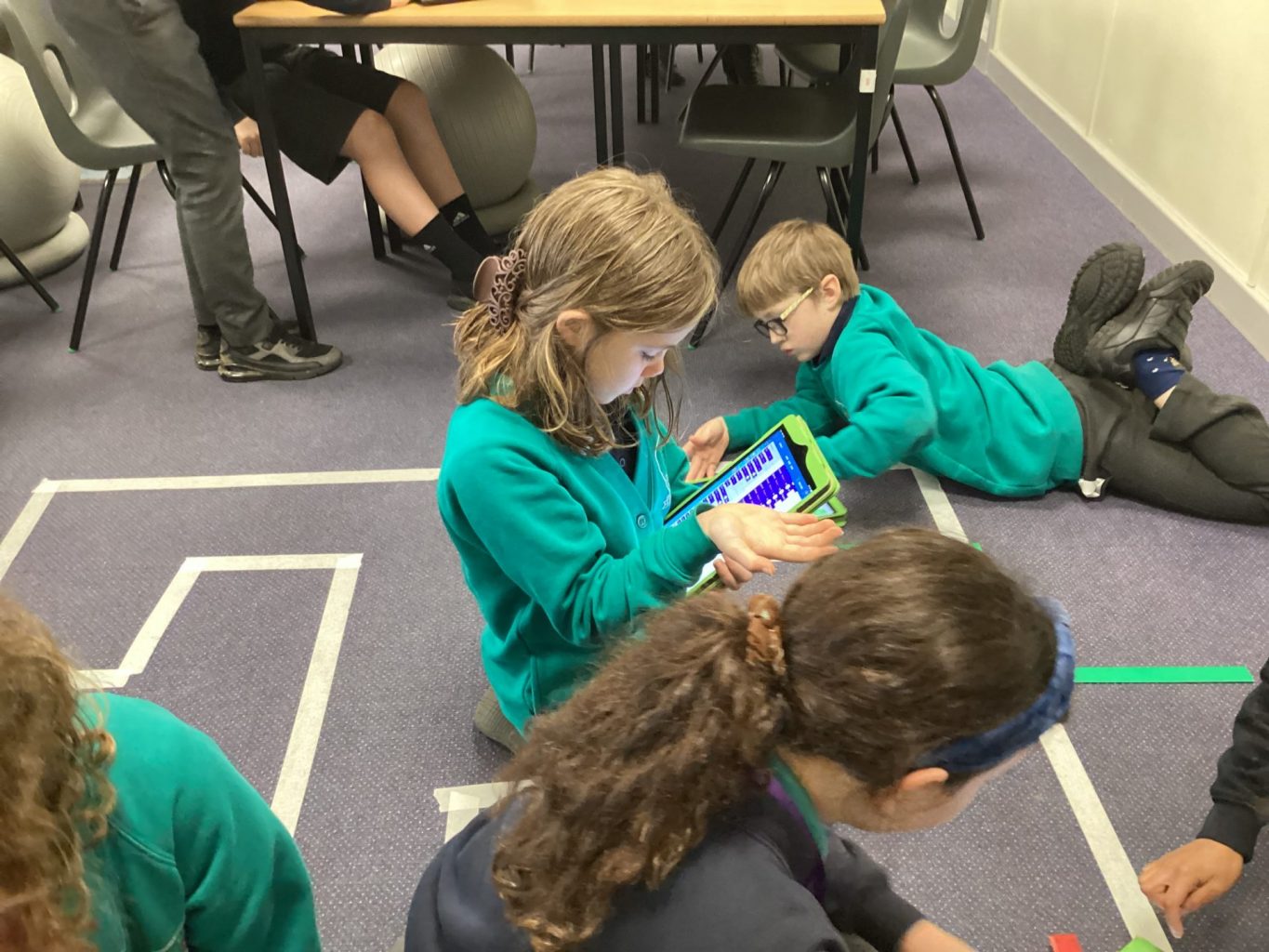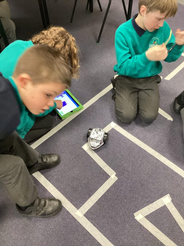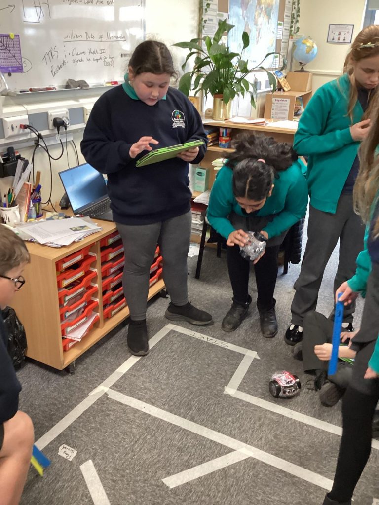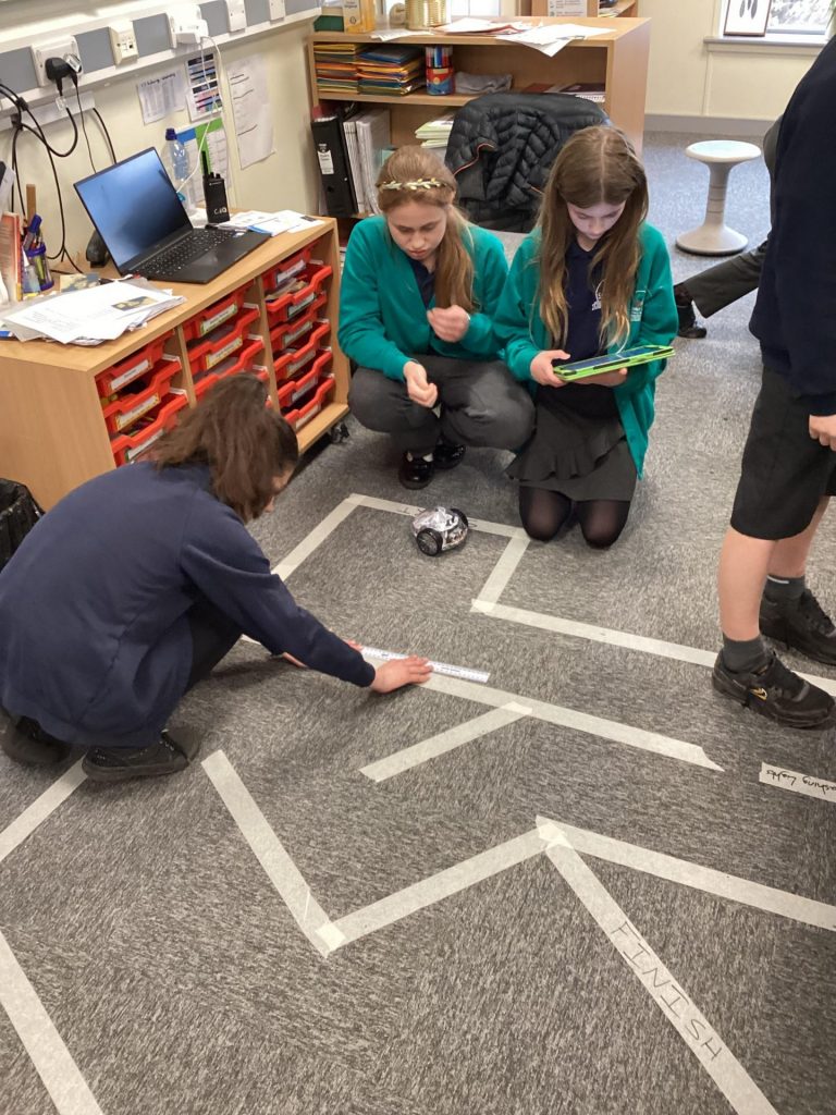 In computing, using the Ino-Bots, pupils were challenged with coding their bot to navigate through a maze. At varying locations the bot then had to make lights flash and play a sound. Pupils used their understanding of measure and angles to ensure the bot didn’t touch the white lines and complete the maze successfully.