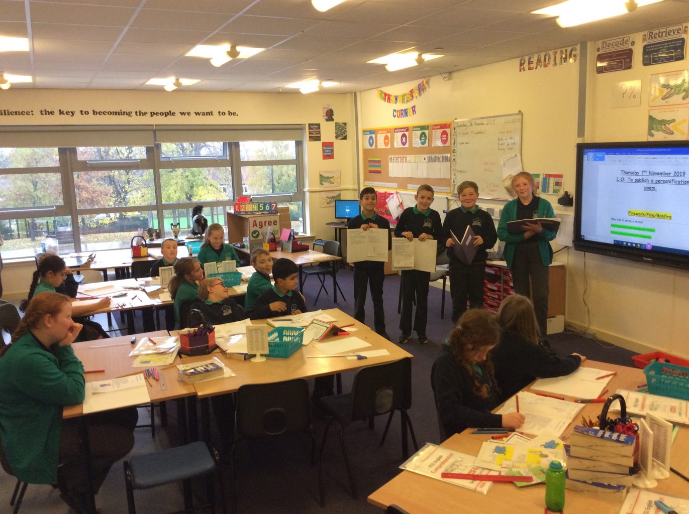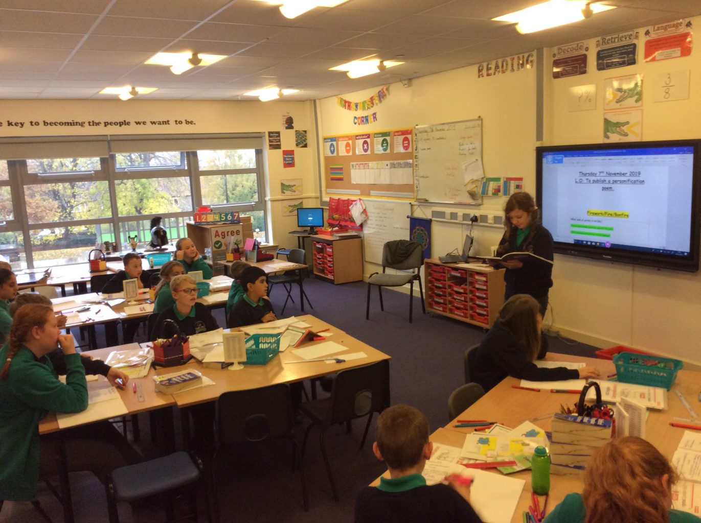 In English this week, all three classes have been exploring the use of figurative language within poetry. Using bonfire night as a stimulus, the children have gathered ideas regarding its impact on the senses to compose poetic sentences for their write. The pupils have also created their own interpretive dance and performed their poems in front of an audience.