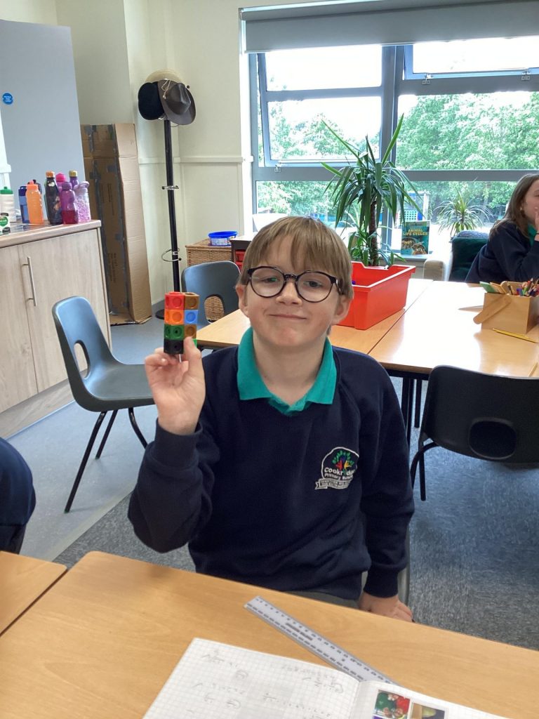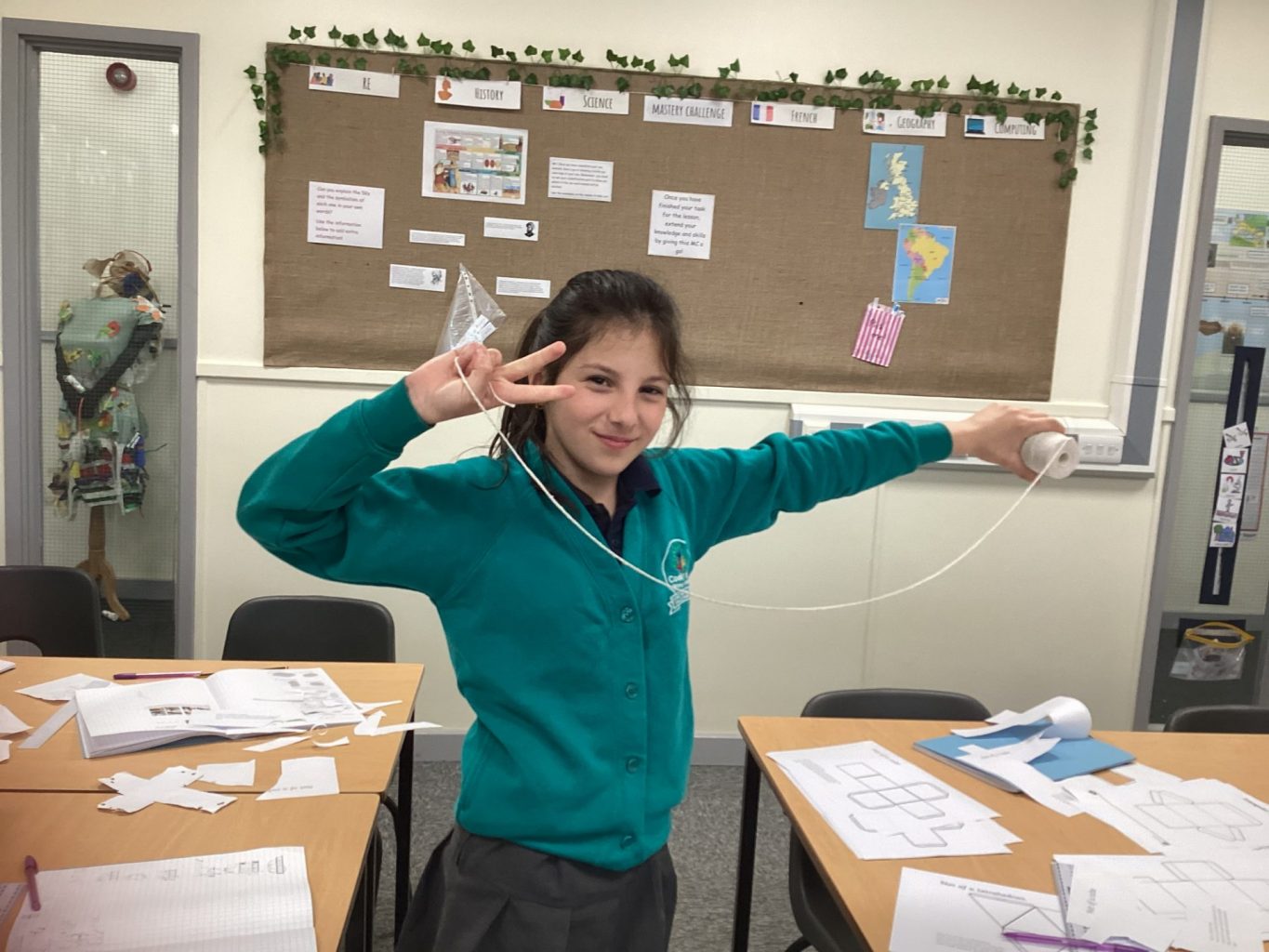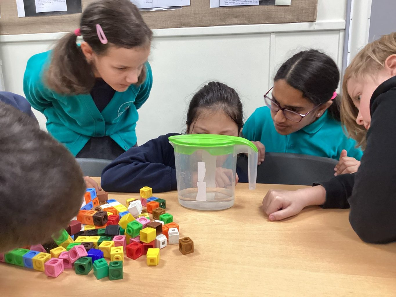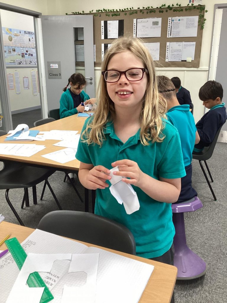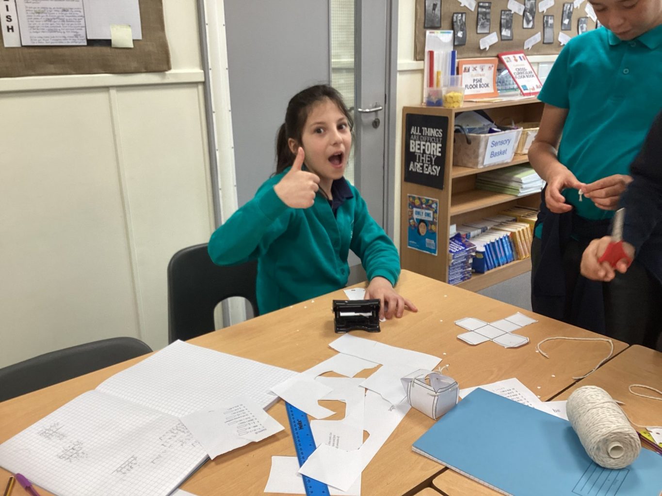 This week, Miss Chambers’ maths class have bee busy! Firstly, the children in Miss Chambers’ maths class started the lesson by being given some measuring jugs with the units are covered up. They estimated how much water they thought was in them. As a table group, they compared their strategies for estimating the capacity of the water jugs. Then, they used multi-link to investigate volume. Secondly, over the course of this week, they developed their ability to identify 3-D shapes from 2-D representations. Using a whole-punch and string, they brought nets to life! Once they had made each 3-D shape, using nets, they identified how many edges, faces and vertices it had.
