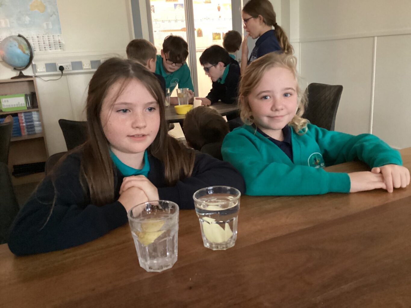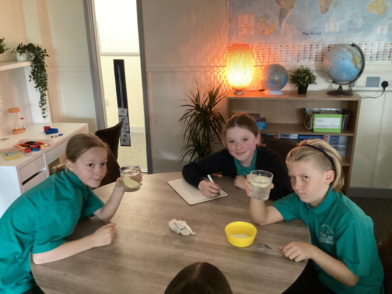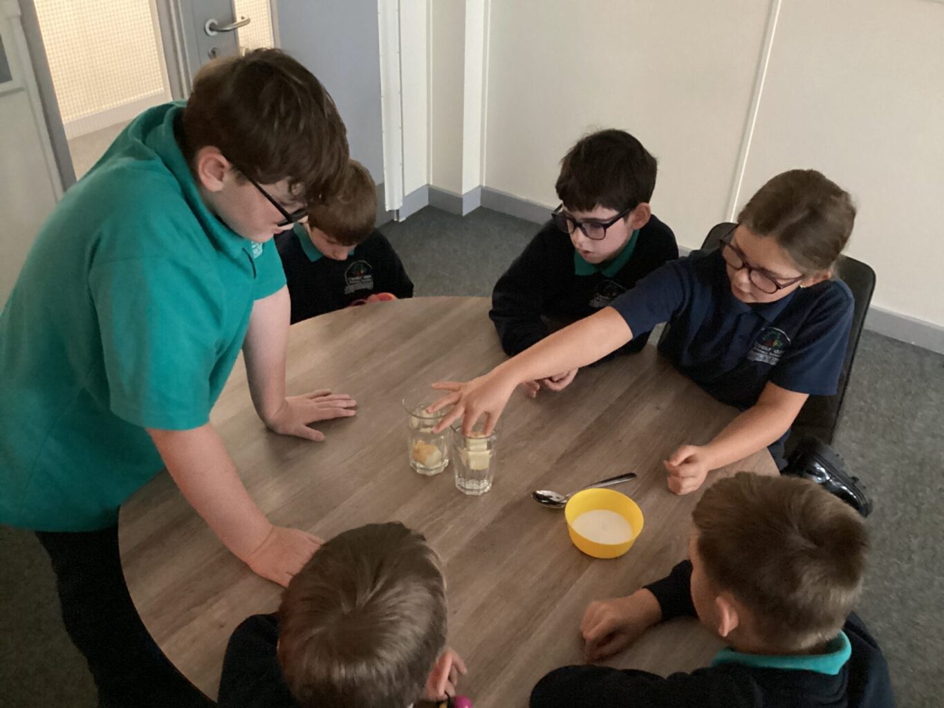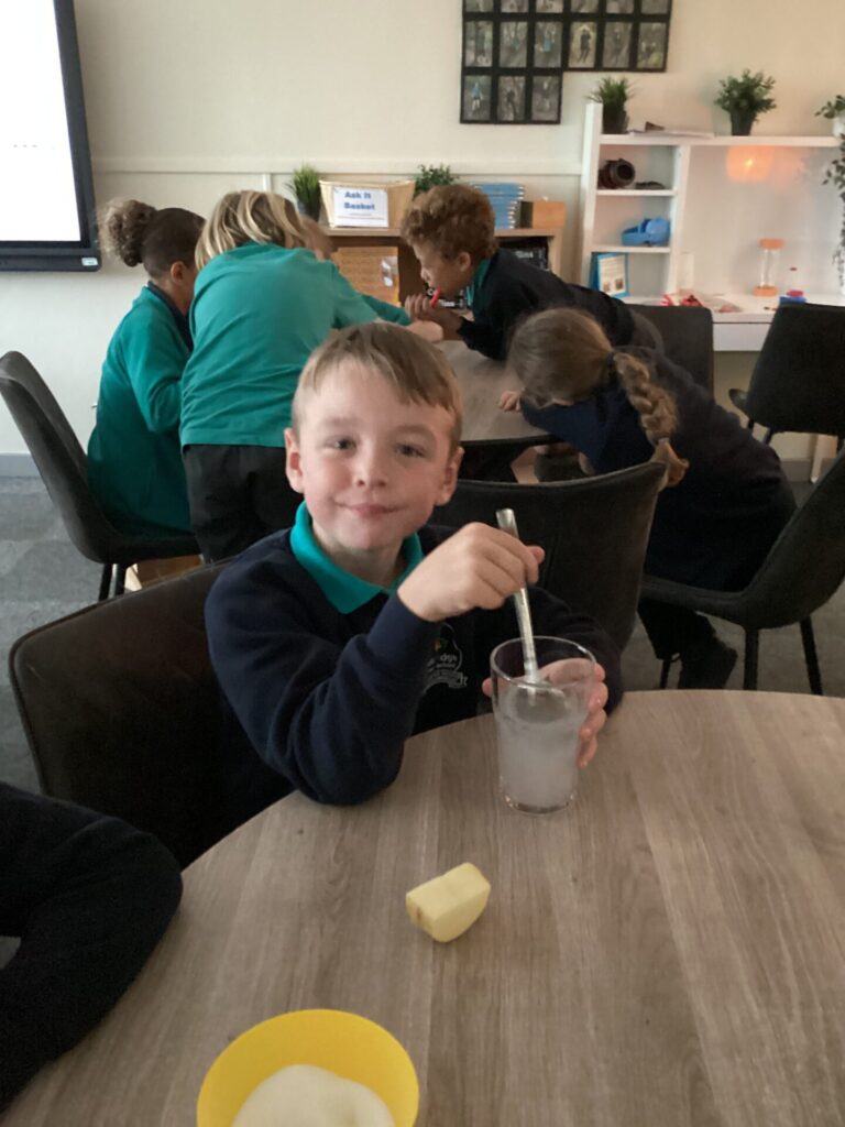 In science, UKS2 were experimenting with the density of liquids an solids. First, they experimented how well potato sinks in water. Then saturated the water with salt to create a solution, and compared the findings. Finally, they experimented with the density of food colouring and water.