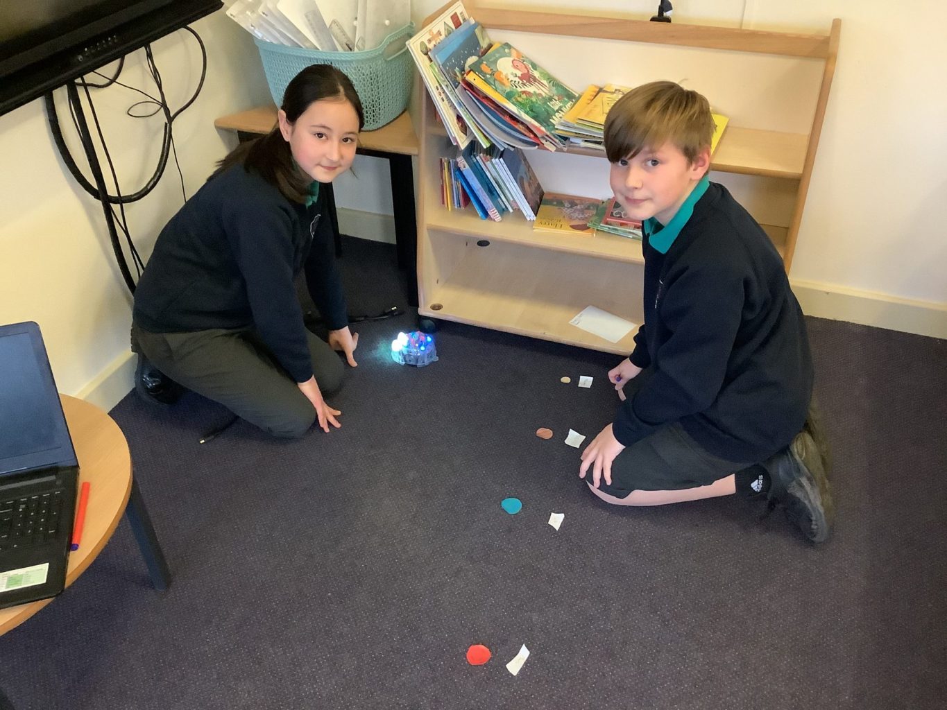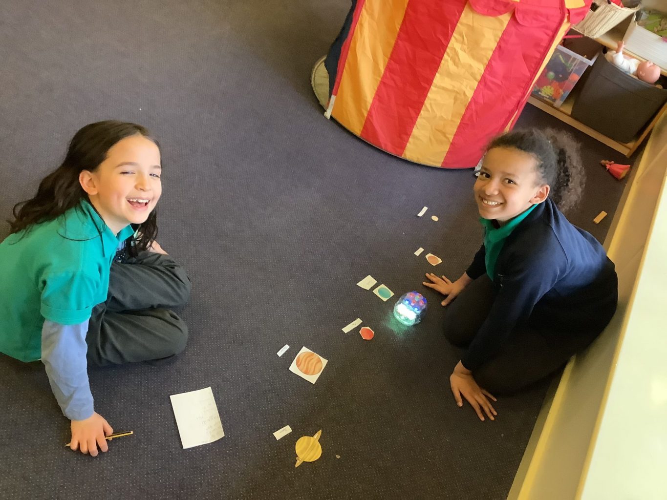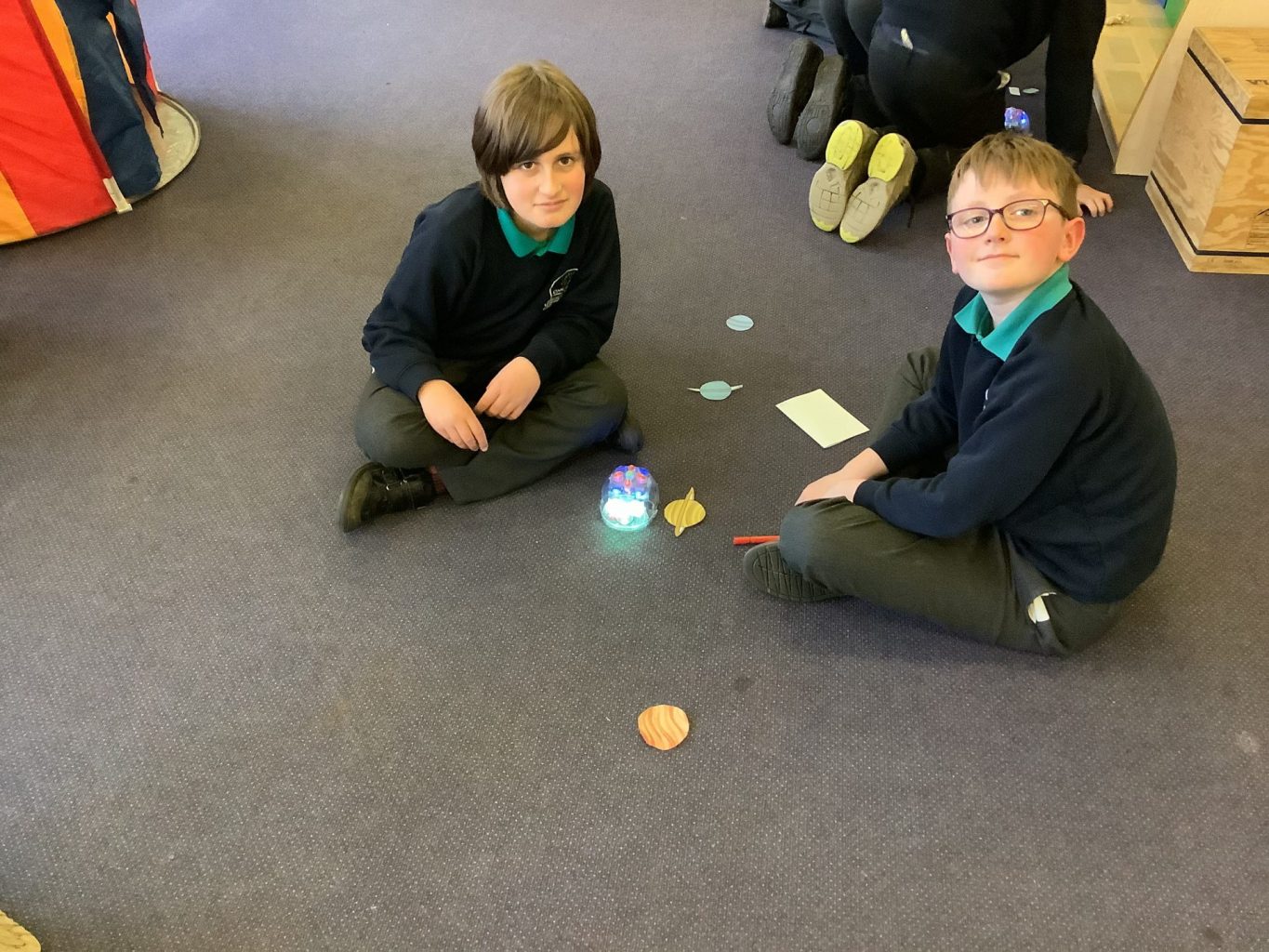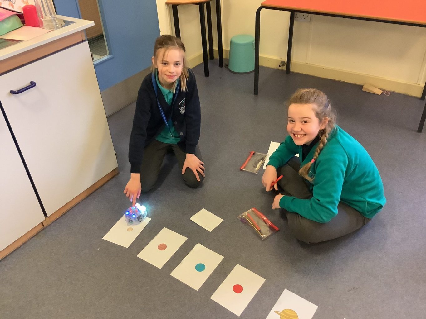 They were given planets to cut out and order as a team. After this, they used Bee-bots to input their algorithms and travel around space. The children were challenged to travel in straight lines and curved lines: questioning how this affected their algorithms. Finally, the children transcribed their algorithms.