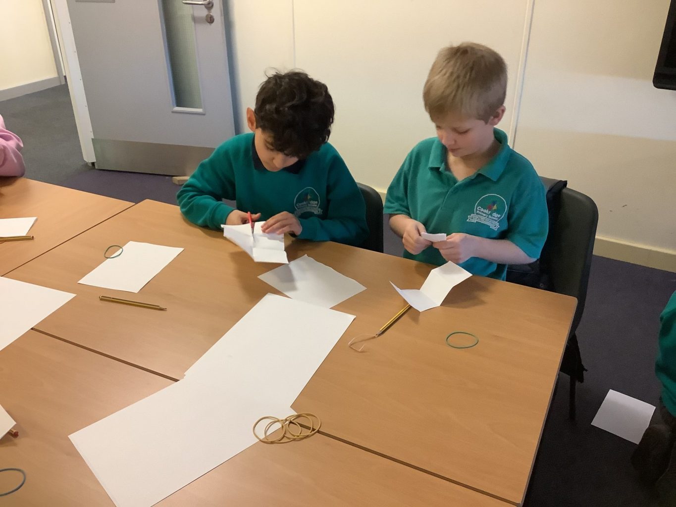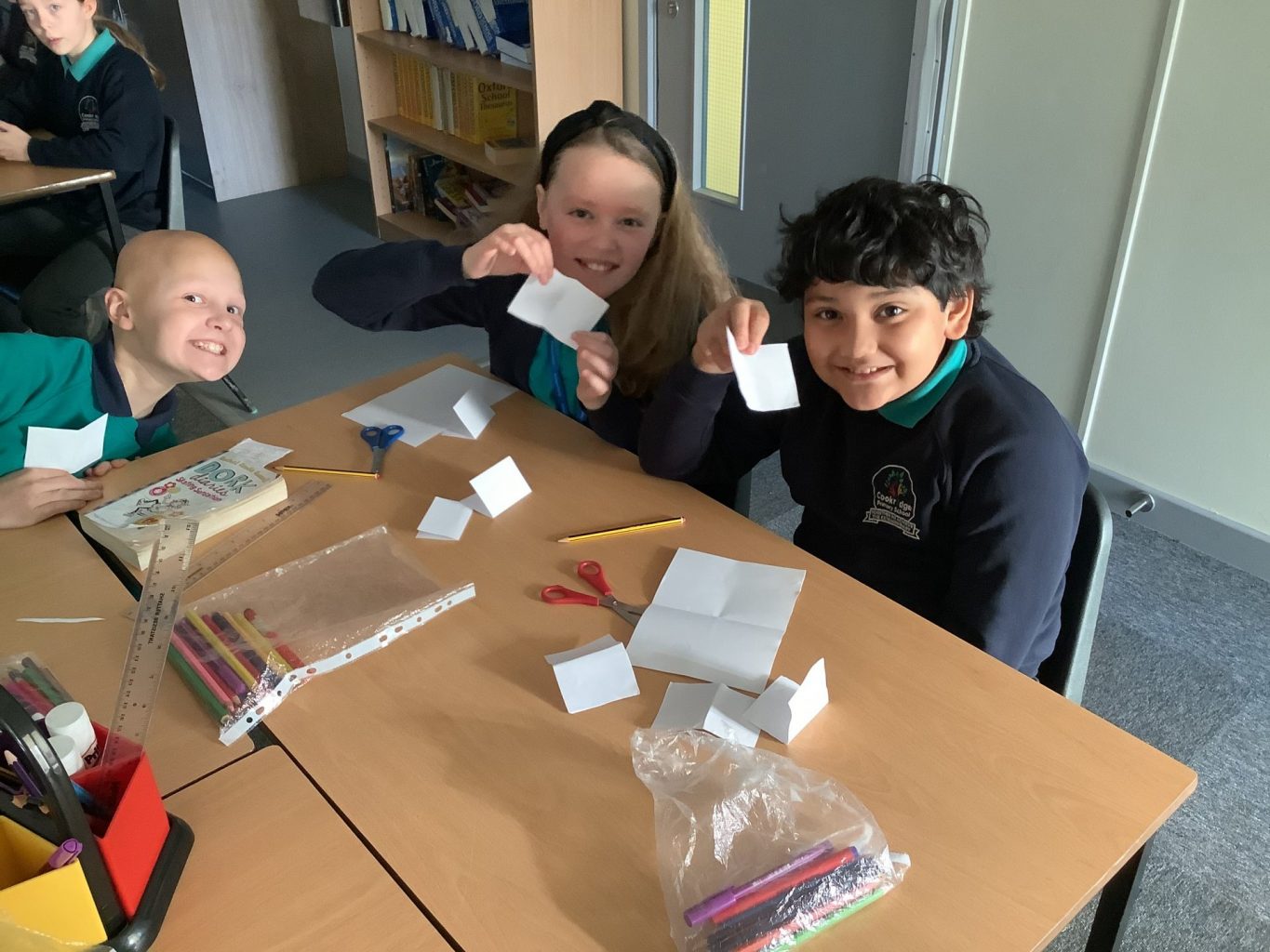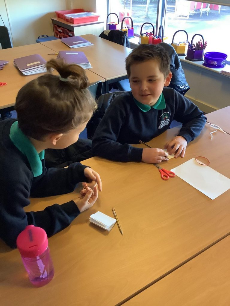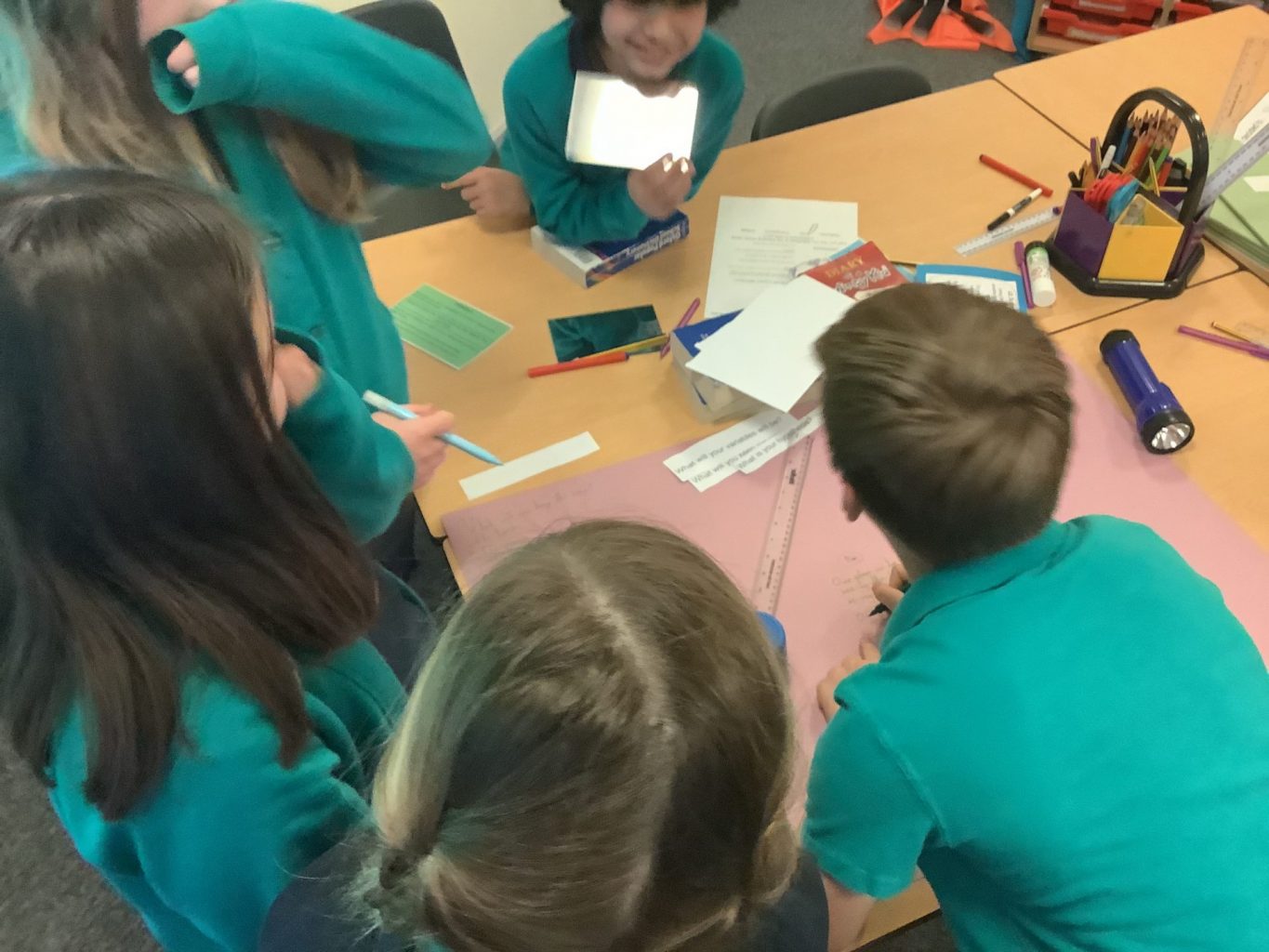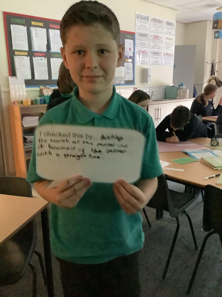 Secondly, the children were given the hypothesis: “Shadows have the same shape as the objects that cast them.” Each group worked together to conduct their own experiment to prove or disprove this hypothesis. They had to consider how they would conduct a fair test, measure their results and ultimately write their own conclusion. They conducted their experiments and discussed their results – considering how the fact that light travels in straight lines explains the existence of shadows.