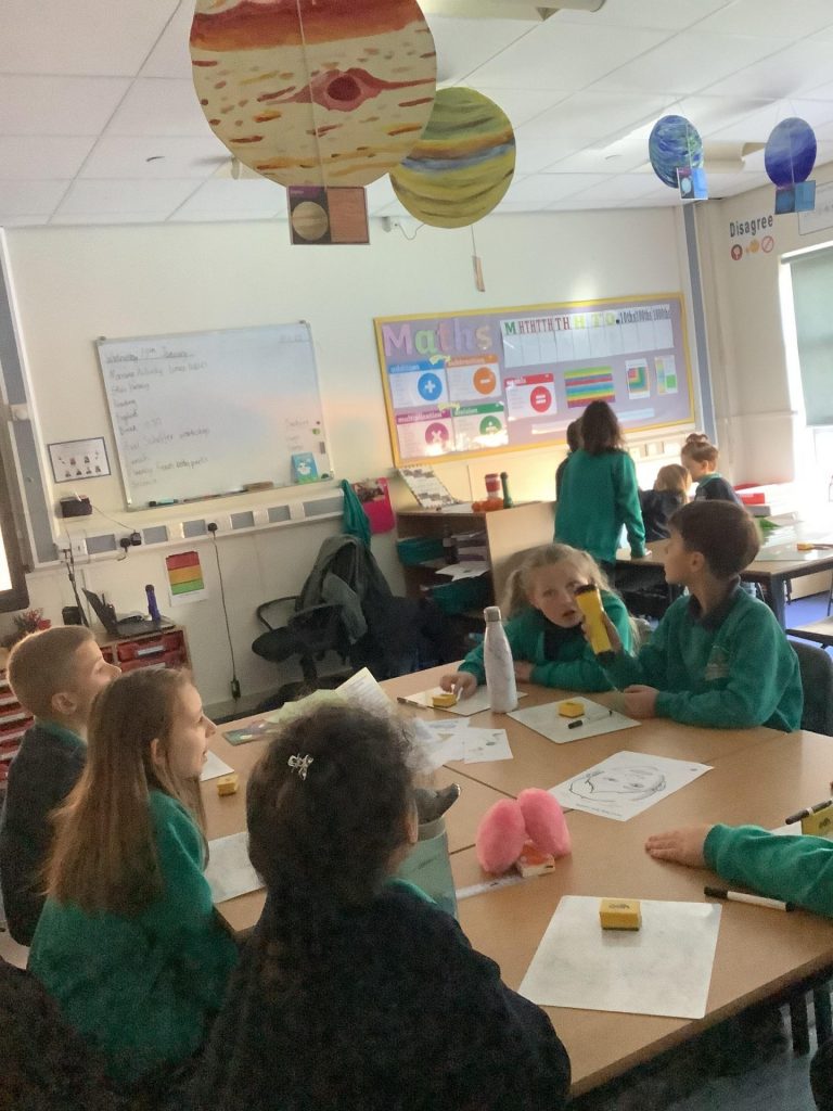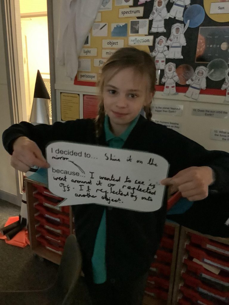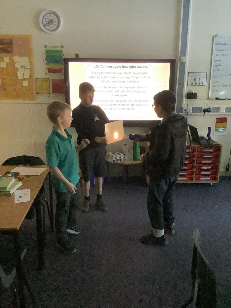 Firstly, the children used torches, mirrors and different objects to investigate whether light travels in straight lines or if it can bend around an object. Each group came to their own conclusion and used thought bubbles with sentences openers to prove their conclusion. We discussed our findings as a class and found that light travels in straight lines.