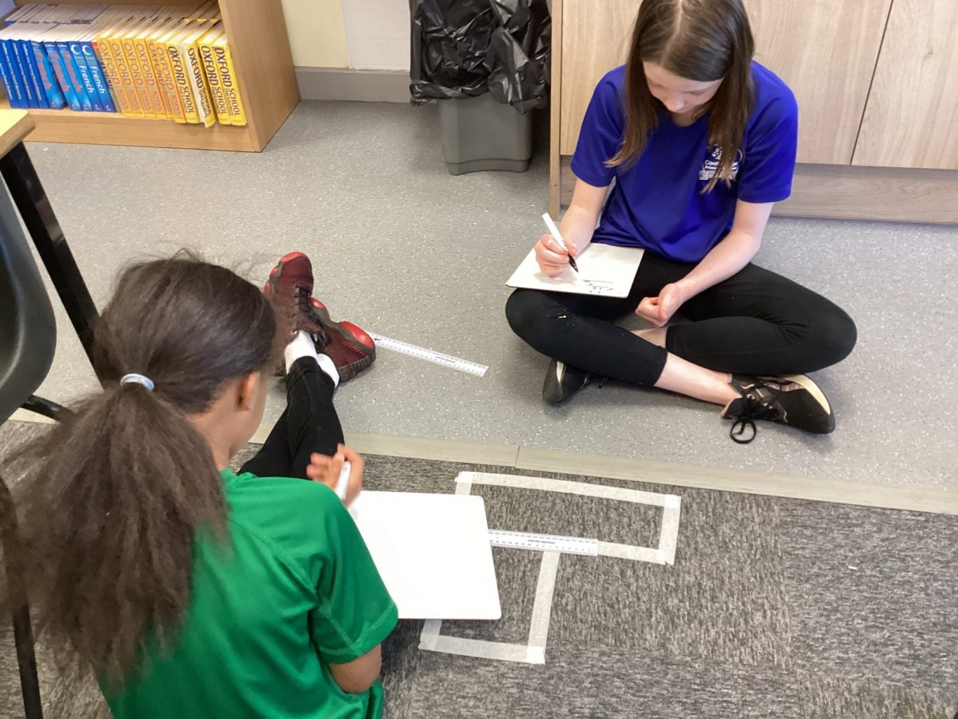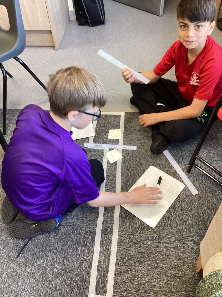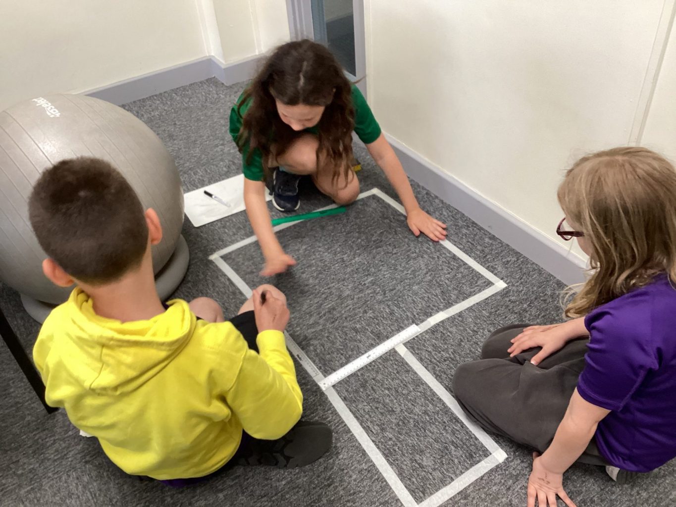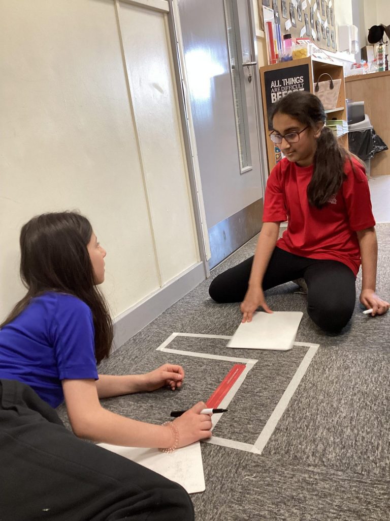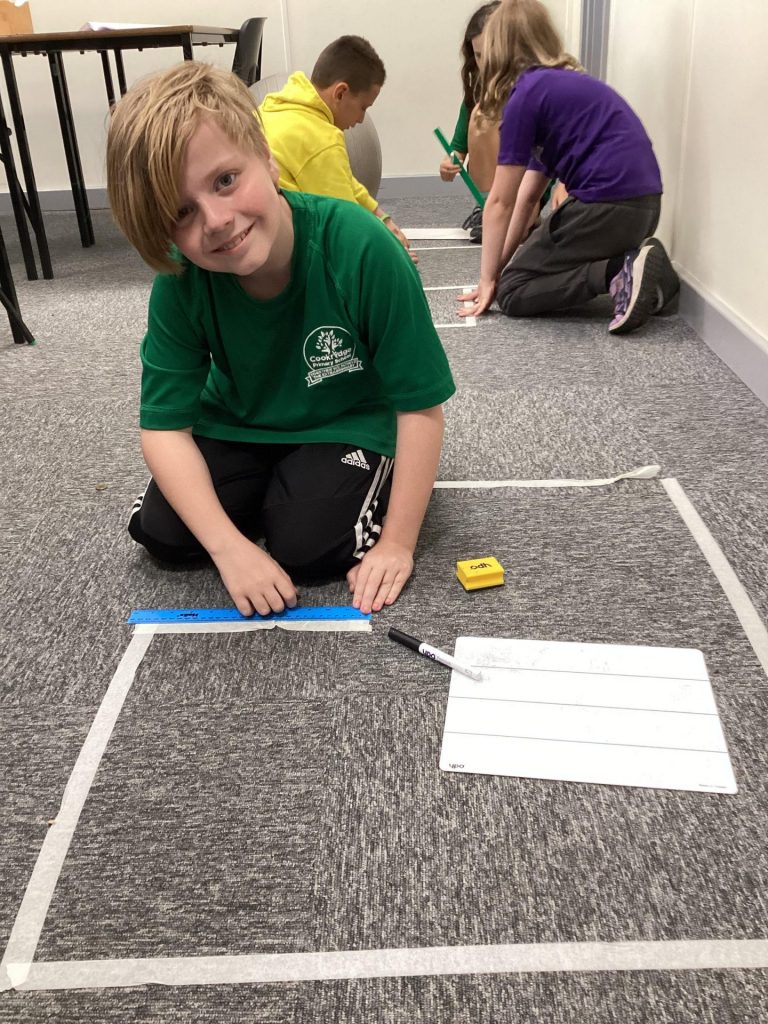 The children in Miss Chambers’ maths class were given different compound shapes made out of masking tape around our room. In small groups, they had to work out the perimeter and area of each shape.