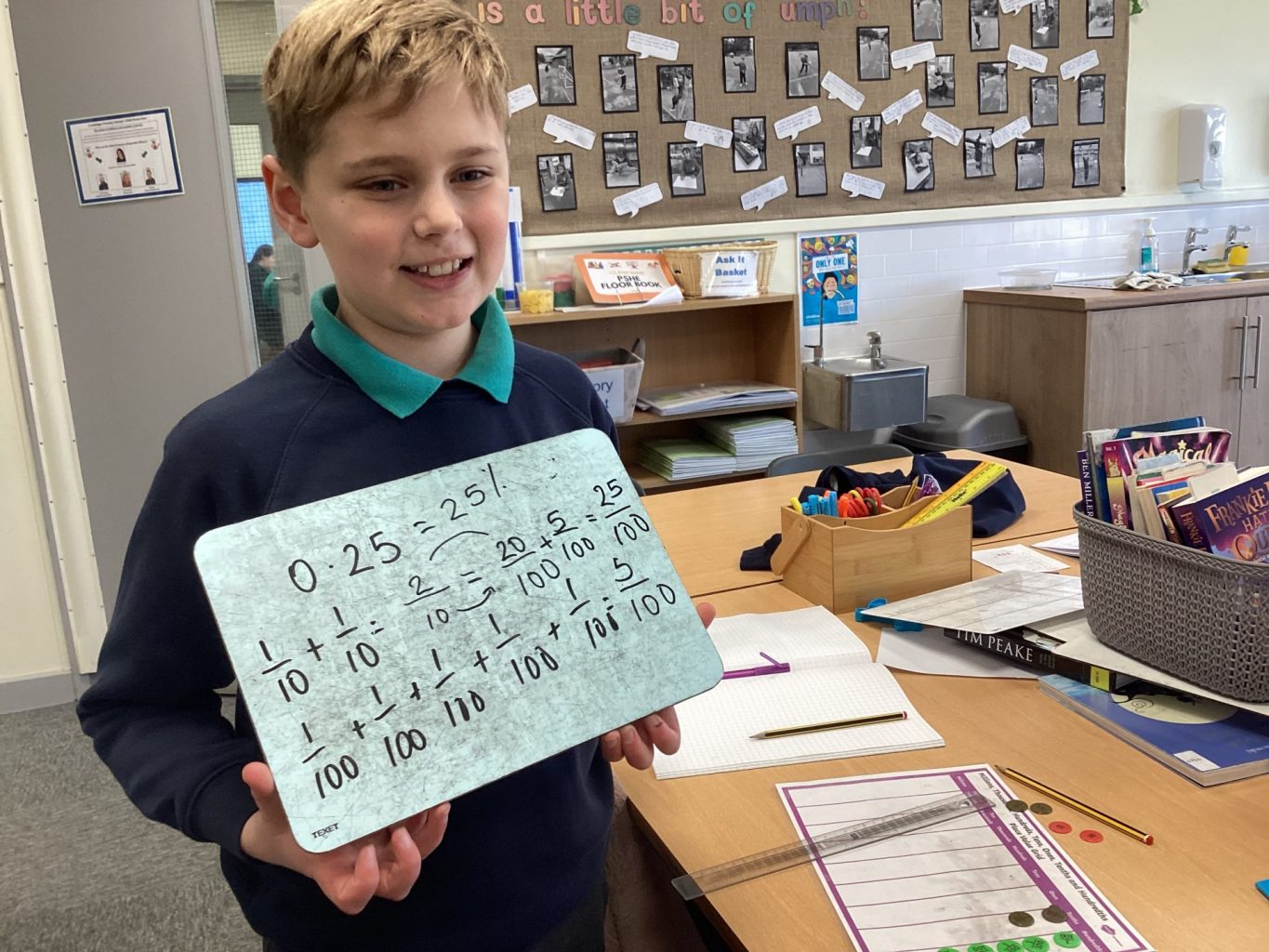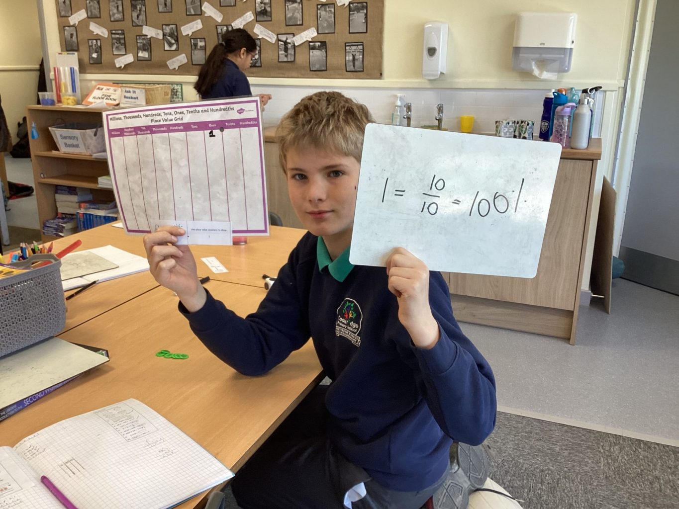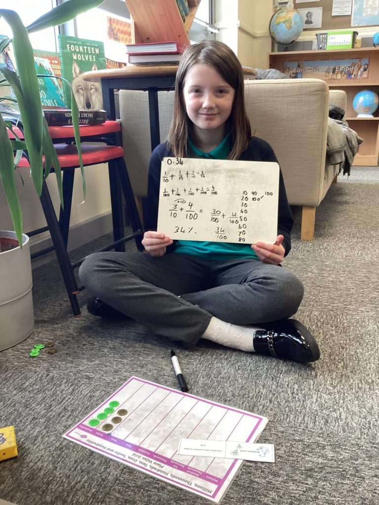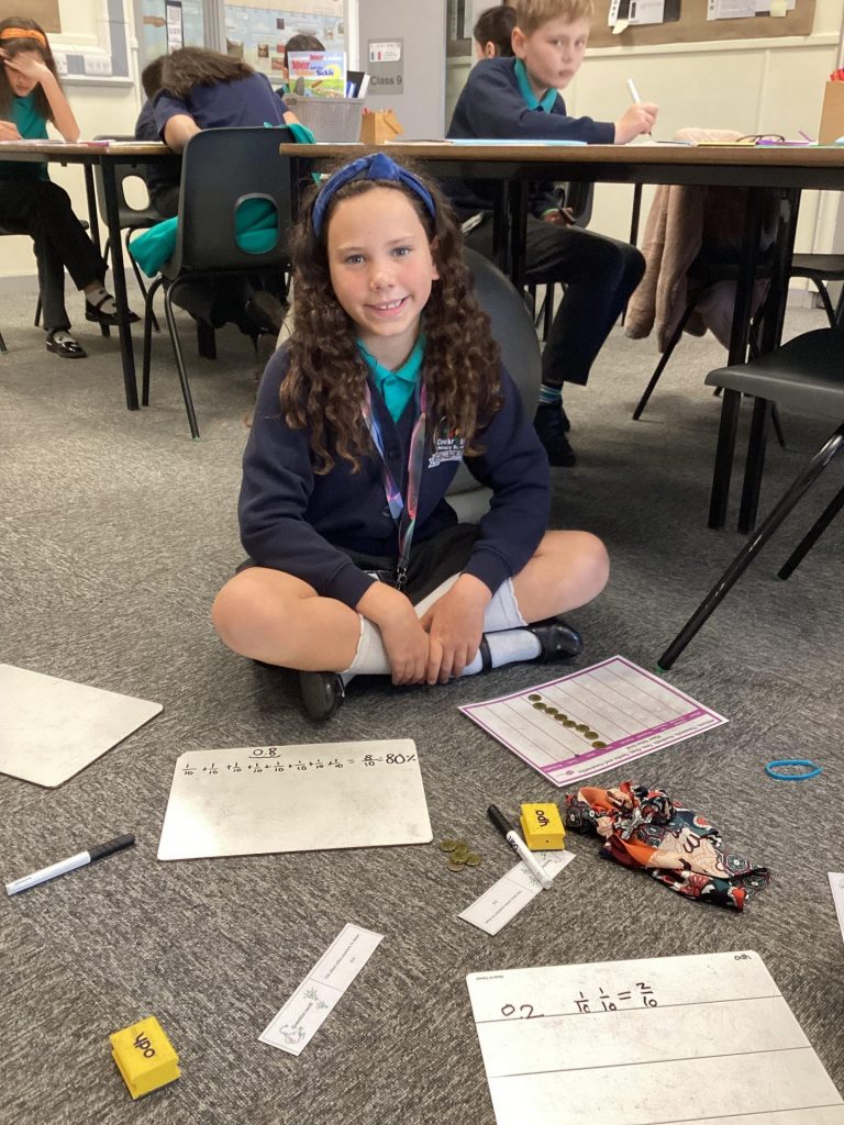 Over the course of yesterday and today, the children from Miss Chambers’ maths class used place value counters to create different decimal, fraction and percentage equivalents. They chose a question card and built the decimal using place value counters on a place value chart. After having shown their repeated fraction addition number sentences, they showed the percentage and fraction equivalents to their decimal.