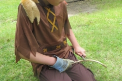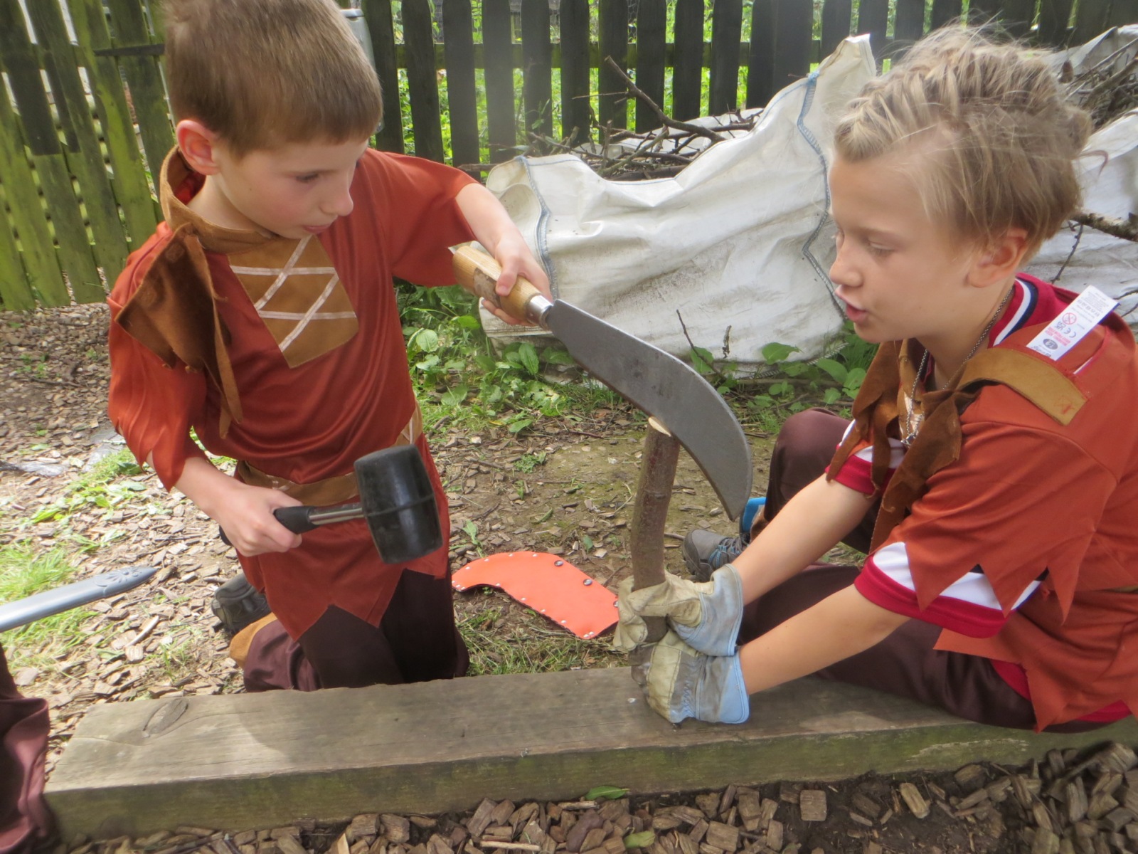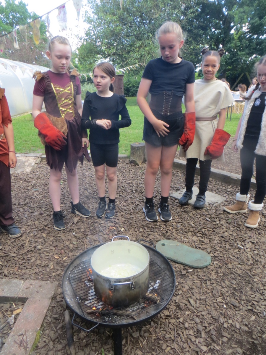 Over the past two days, pupils across LKS2 have taken part in Viking experience days in school. One of these activities has been in our Forest School area which had been transformed into a Viking settlement – classes became villages; pupils became villagers. Working together, they had to take on some of the roles Vikings did which included crafting and cooking. In our fire pit area, villagers worked together to light and maintain a fire using bill hooks for splitting the wood. Once hot enough, the fire was used for cooking and the villagers prepared and cooked a traditional Viking meal – a delicious vegetable and herb soup with warm bread. They had to peel and chop a variety of vegetables including onions, leeks and carrots and scoured our herb garden for rosemary, sage and thyme. Away from that end of the village, villagers plaited and braided necklaces and bracelets, adding in wooden beads by carefully threading them through. There was also rune writing where villagers could practice writing their names and messages to each other using the Viking alphabet. Finally, there was a tool area where villagers could whittle, saw firewood and put holes in wood using palm drills, bow saws and knives. The village was a hive of activity throughout and we were even lucky enough for Olaf the Viking to appear who told us an ancient saga about the beginning of the world according to Viking beliefs.