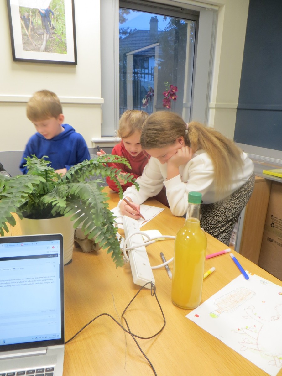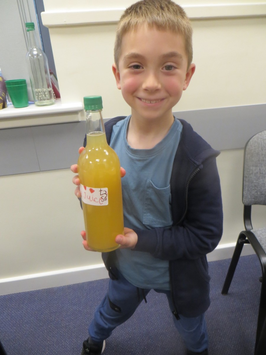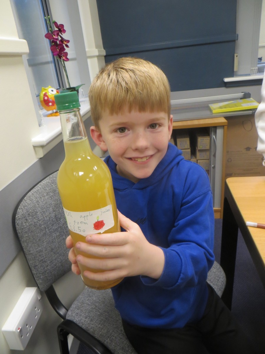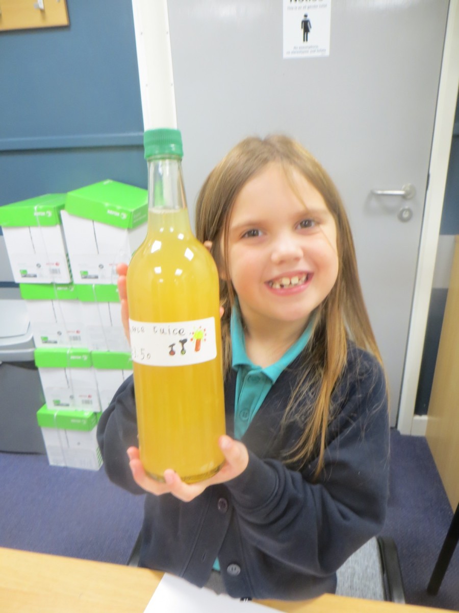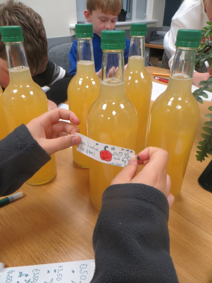 It was a little bit of a different Wellbeing Wednesday session today as pupils finished off their apple juice project from last week. The bottles had arrived back from Lilac Farm after being pasteurised and all the pupils enjoyed a taster. They were very observant and instantly recognised that after being heated the juice had changed colour and the taste had changed; with many of the pupils preffering the taste now to the fresh juice straight from the press which they sampled last week. Children then set about their task – the promotion to sell the 104 bottles we made! Pupils organised themselves into teams to create an advertisement post for the website, labels for the bottles, a pricing strategy and a poster. Well done team – let’s hope for lots of sales tomorrow!