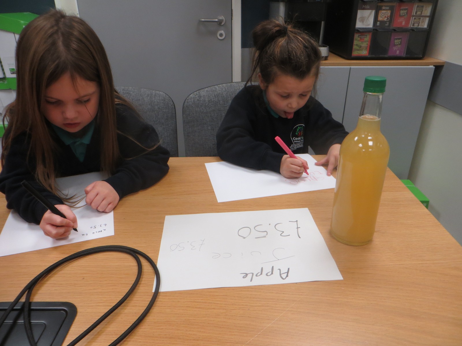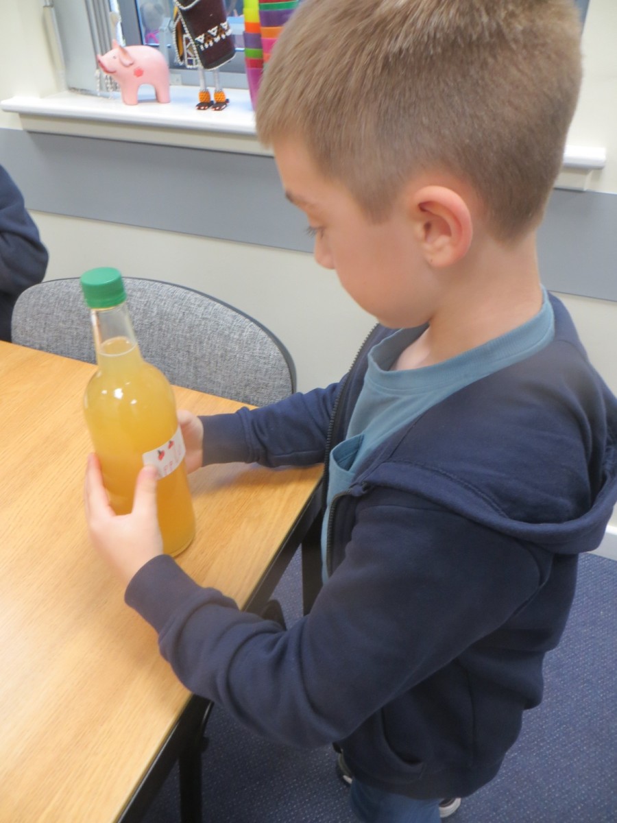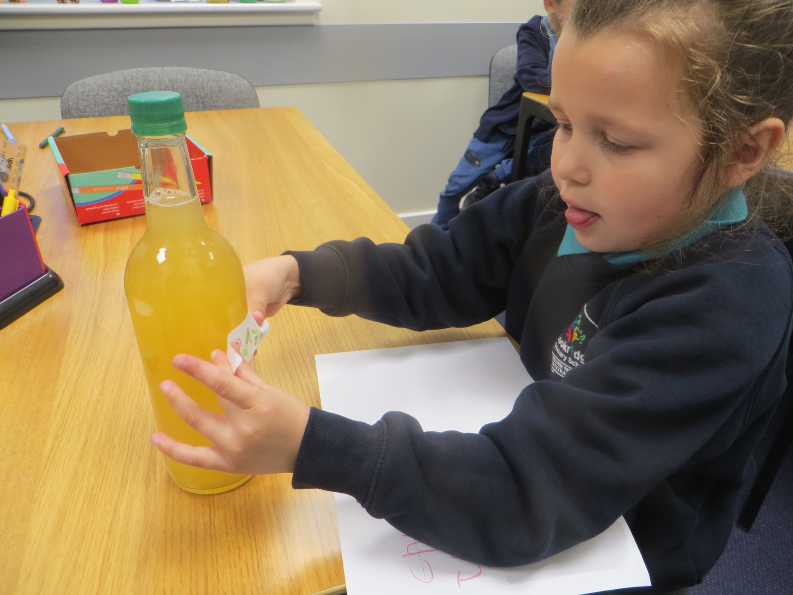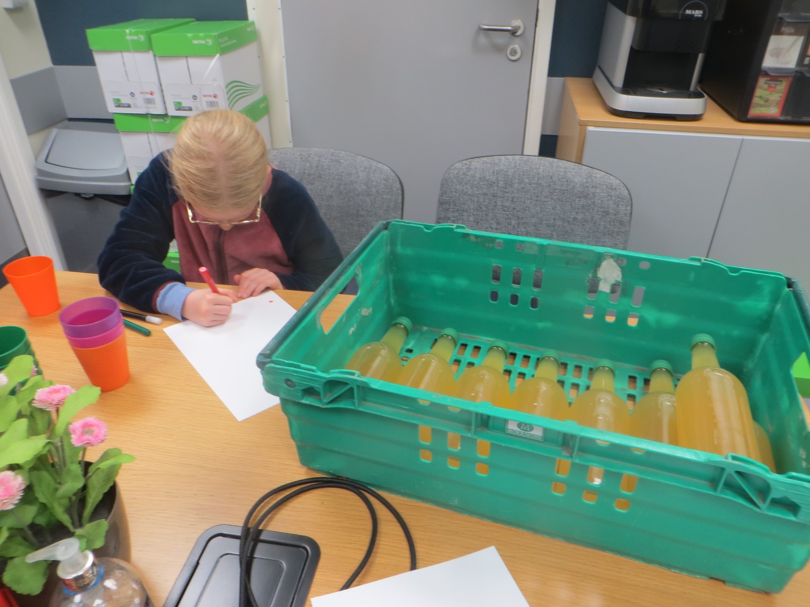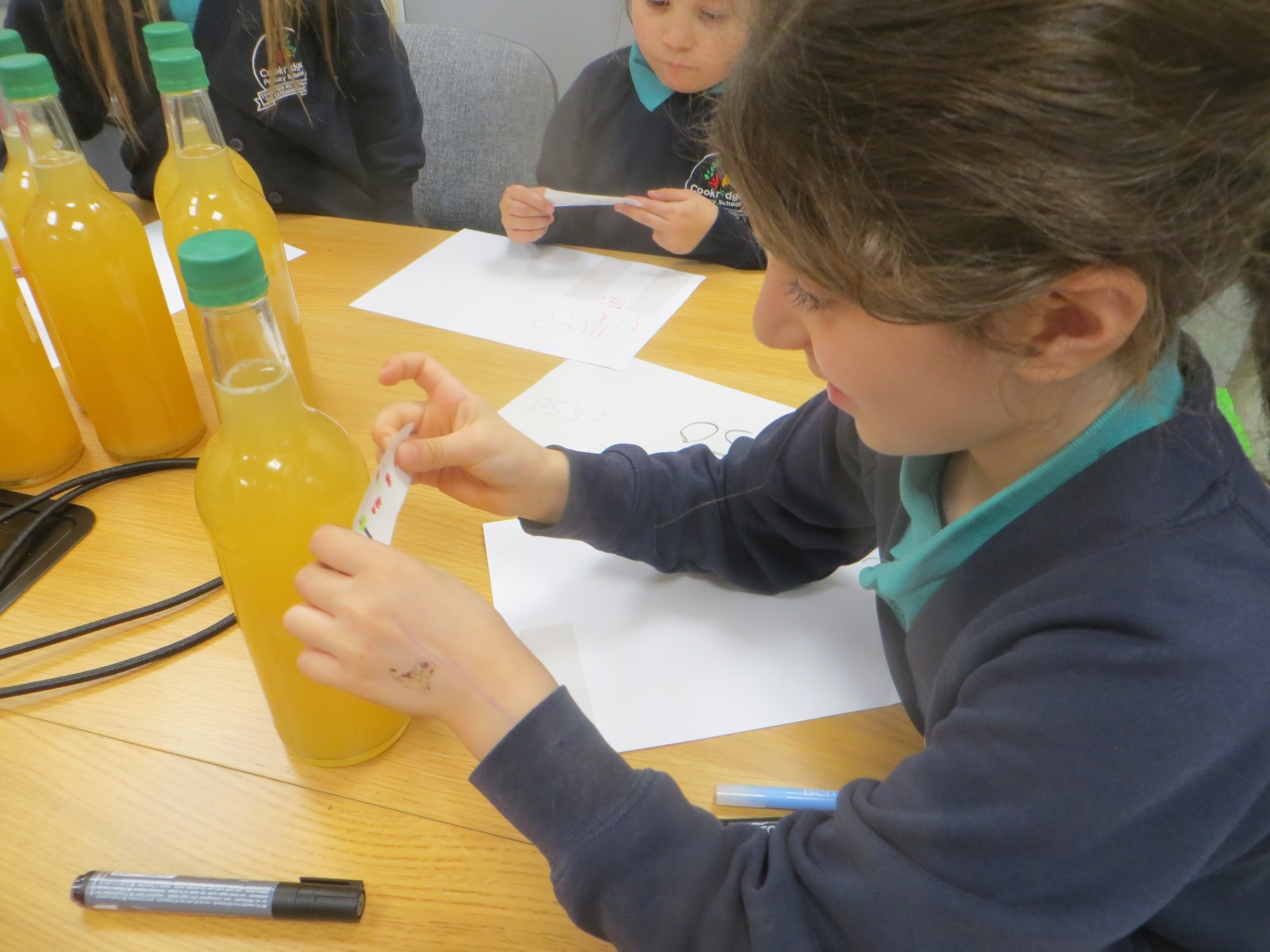 It was a little bit of a different Wellbeing Wednesday session today as pupils finished off their apple juice project from last week. The bottles had arrived back from Lilac Farm after being pasteurised and all the pupils enjoyed a taster. They were very observant and instantly recognised that after being heated the juice had changed colour and the taste had changed; with many of the pupils preffering the taste now to the fresh juice straight from the press which they sampled last week. Children then set about their task – the promotion to sell the 104 bottles we made! Pupils organised themselves into teams to create an advertisement post for the website, labels for the bottles, a pricing strategy and a poster. Well done team – let’s hope for lots of sales tomorrow!