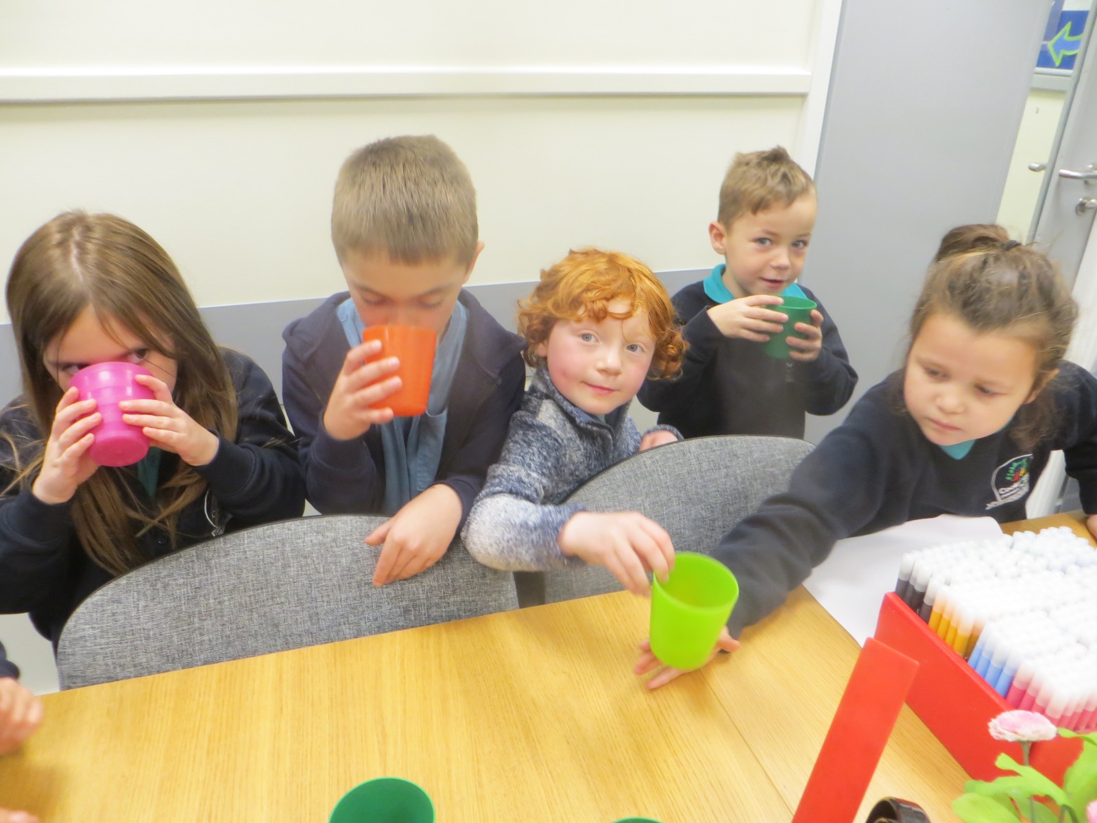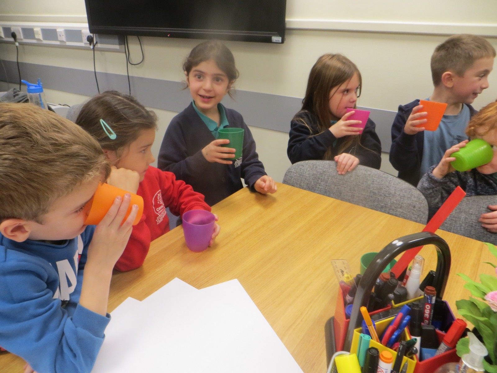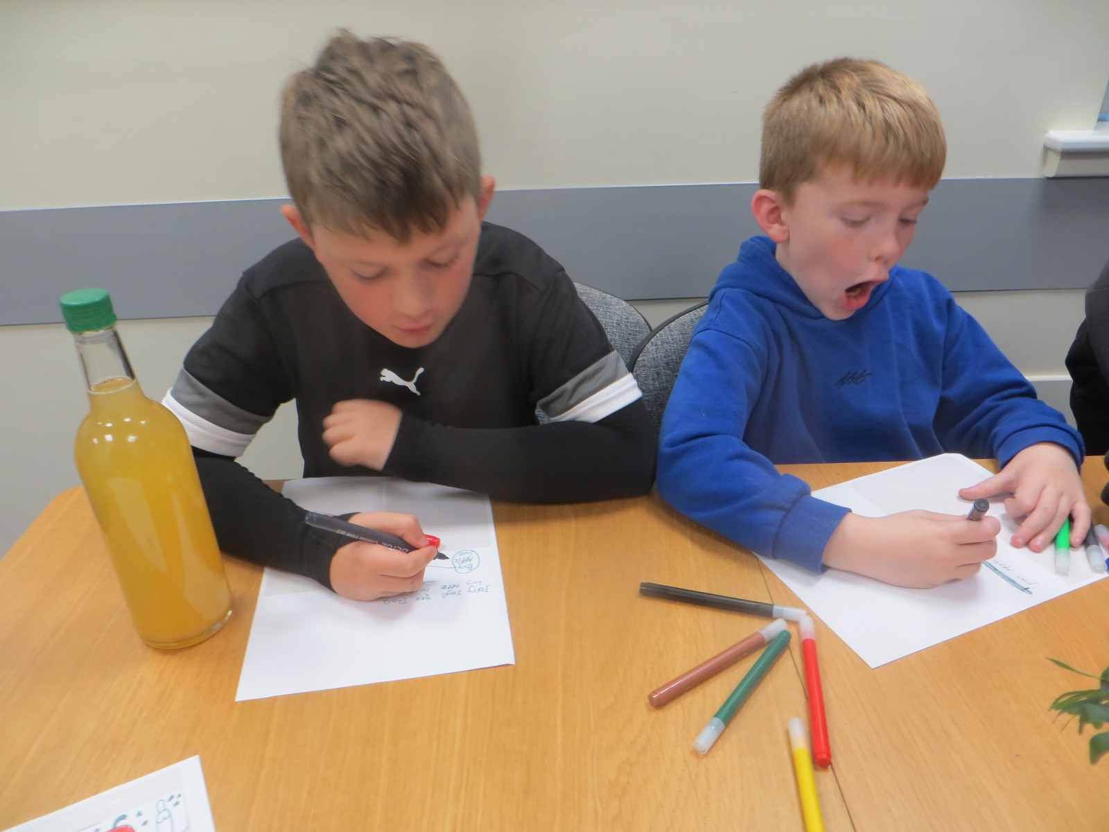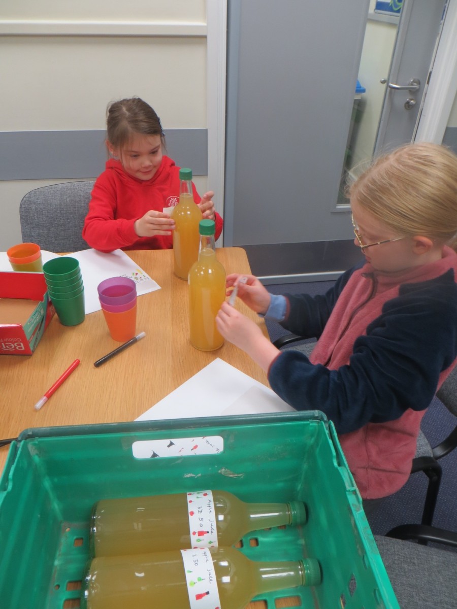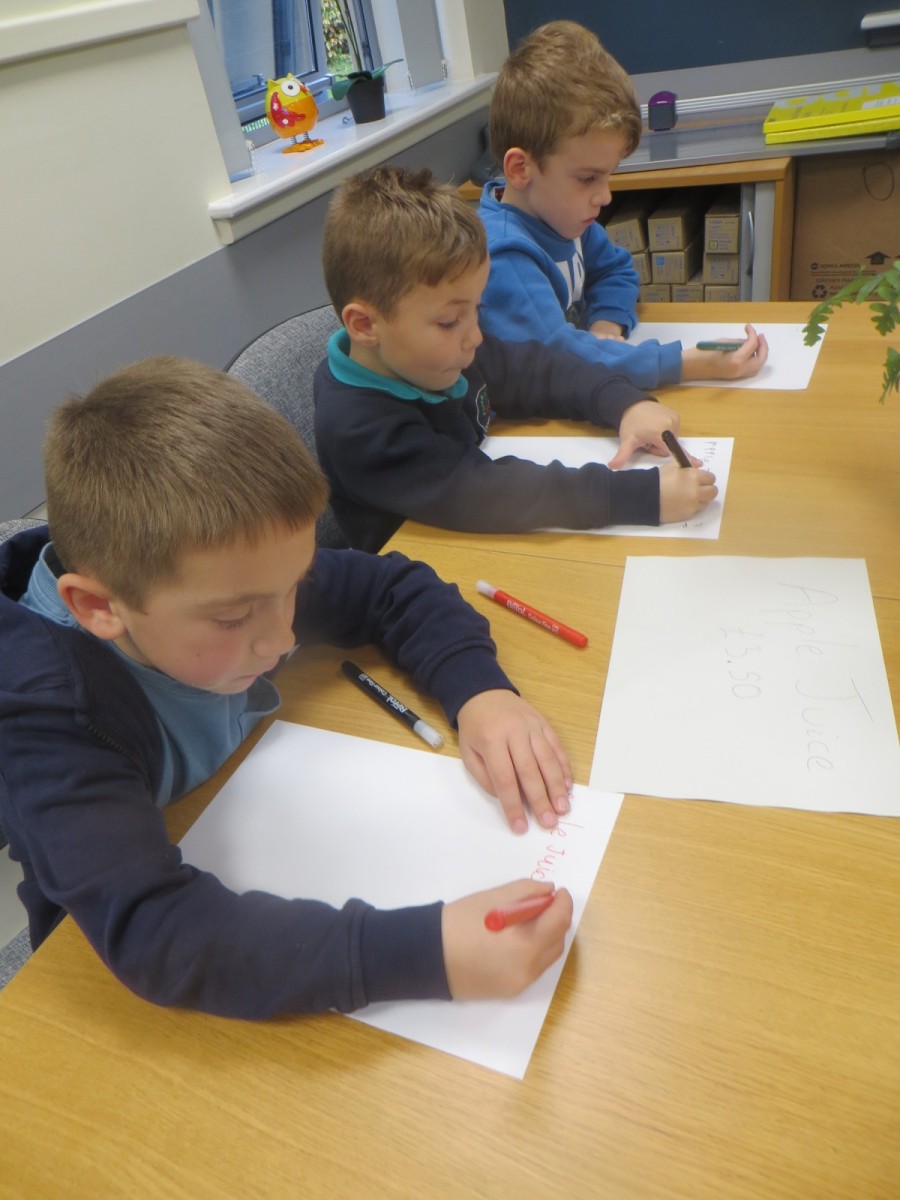 It was a little bit of a different Wellbeing Wednesday session today as pupils finished off their apple juice project from last week. The bottles had arrived back from Lilac Farm after being pasteurised and all the pupils enjoyed a taster. They were very observant and instantly recognised that after being heated the juice had changed colour and the taste had changed; with many of the pupils preffering the taste now to the fresh juice straight from the press which they sampled last week. Children then set about their task – the promotion to sell the 104 bottles we made! Pupils organised themselves into teams to create an advertisement post for the website, labels for the bottles, a pricing strategy and a poster. Well done team – let’s hope for lots of sales tomorrow!