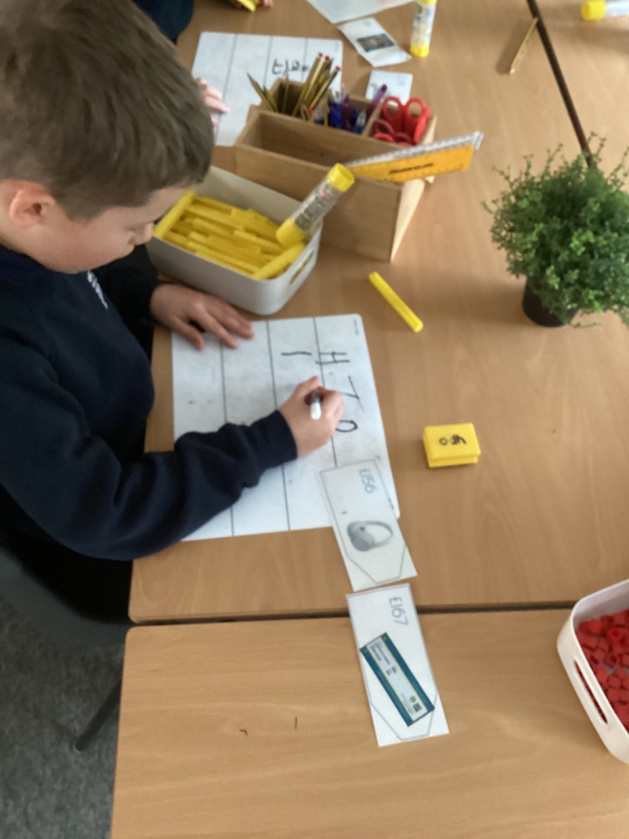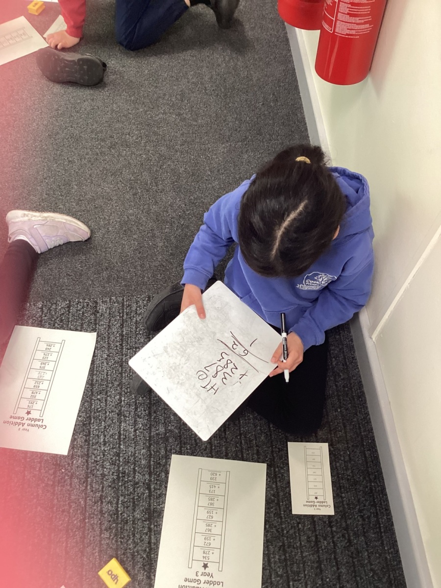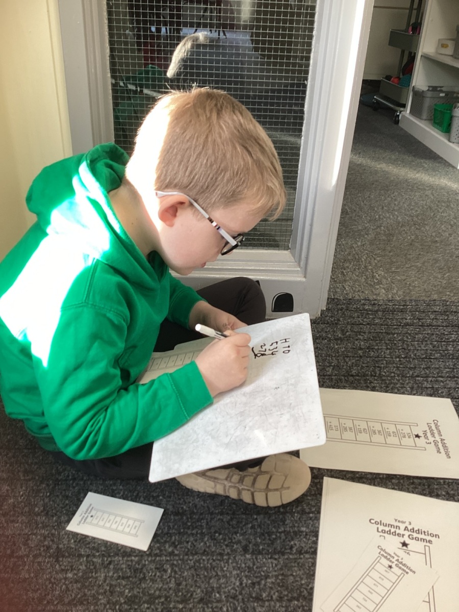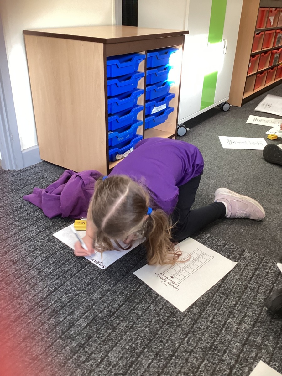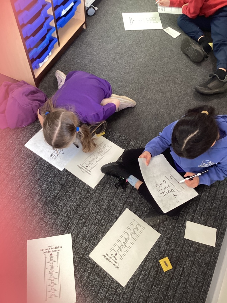 This week in maths, Miss Bourne’s group have been continuing to practise their column addition. They have been working hard to use their knowledge and understanding of place value to show addition of 3 digit numbers using column method. As part of our carousel, they were givensome price tags for possible Christmas presents they would like. They had to add together the cost of the items to find the total. One group practised their addition in a game against a partner. In the game they had to add 3 digit numbers to climb a ladder. The first one to the top won!