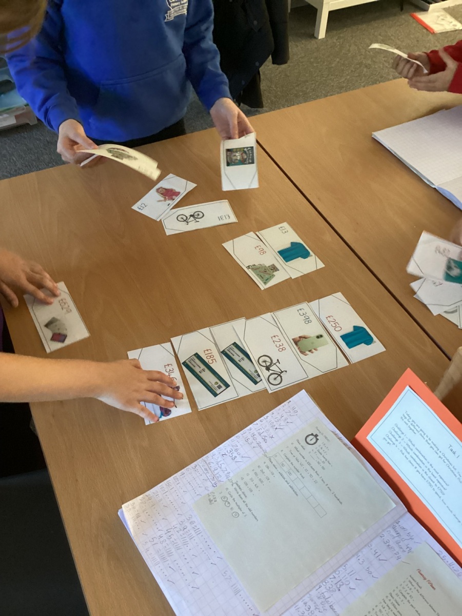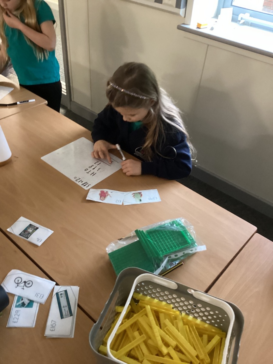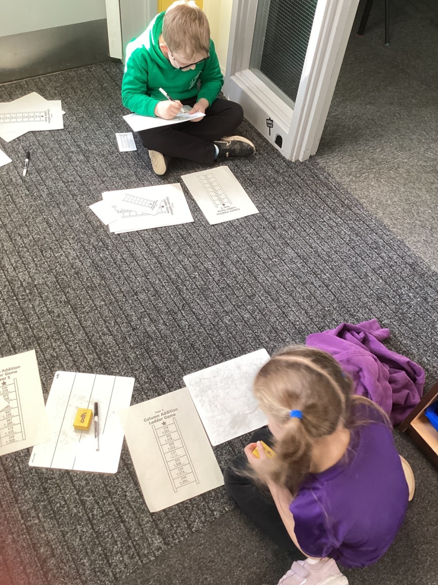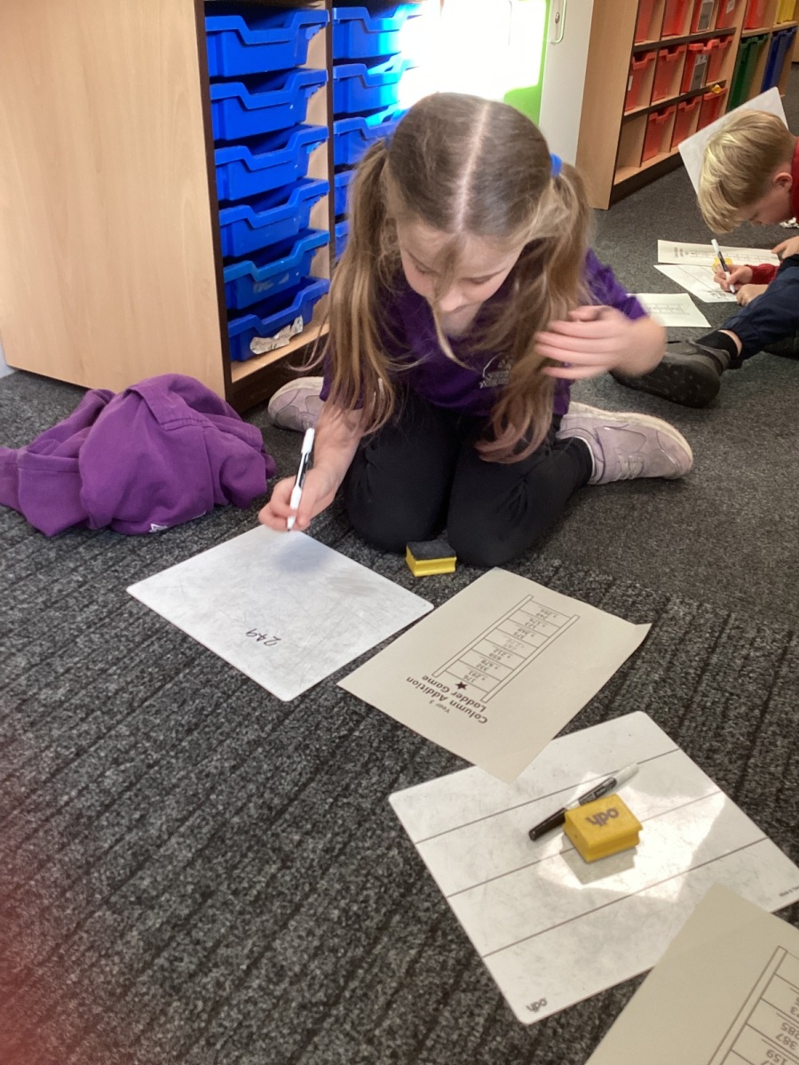 This week in maths, Miss Bourne’s group have been continuing to practise their column addition. They have been working hard to use their knowledge and understanding of place value to show addition of 3 digit numbers using column method. As part of our carousel, they were givensome price tags for possible Christmas presents they would like. They had to add together the cost of the items to find the total. One group practised their addition in a game against a partner. In the game they had to add 3 digit numbers to climb a ladder. The first one to the top won!