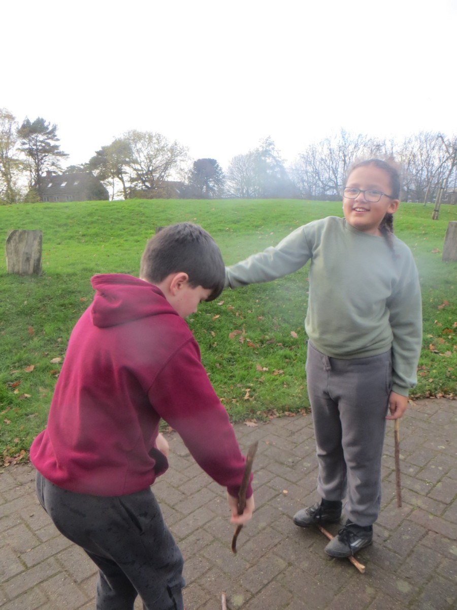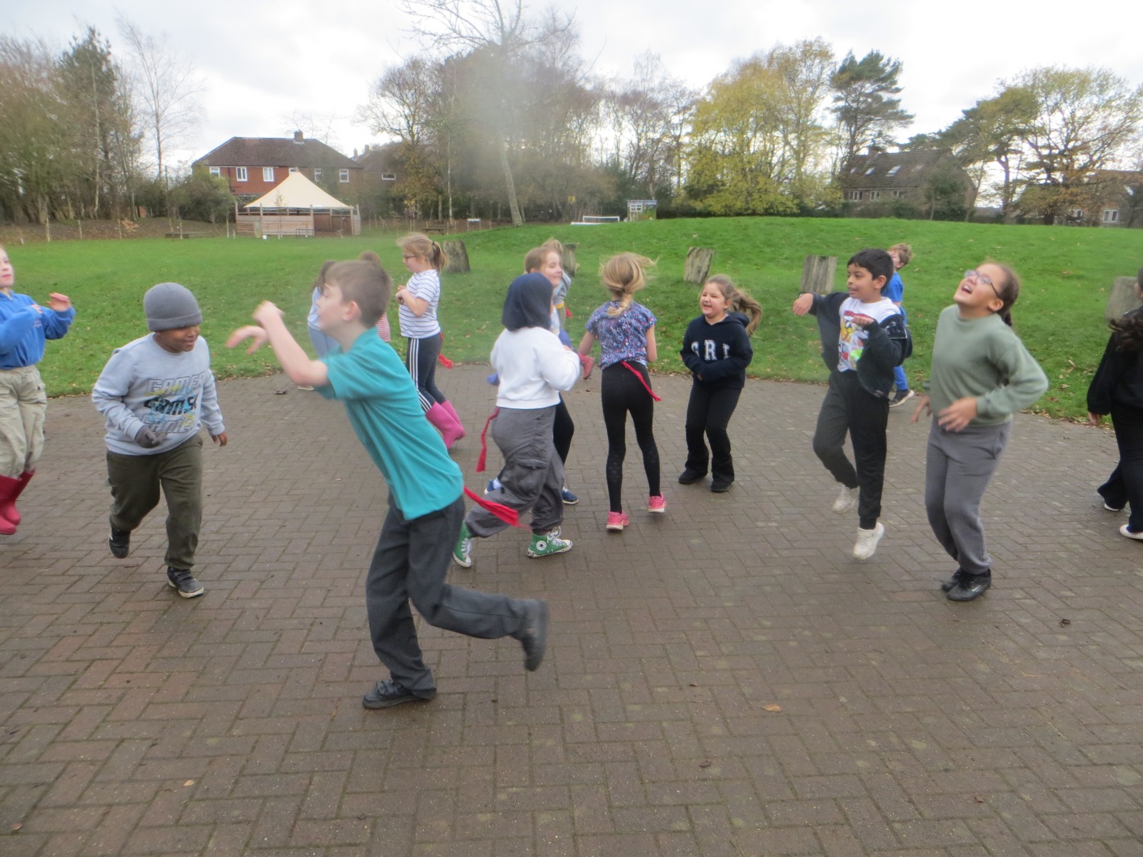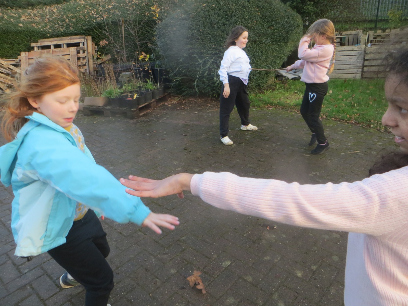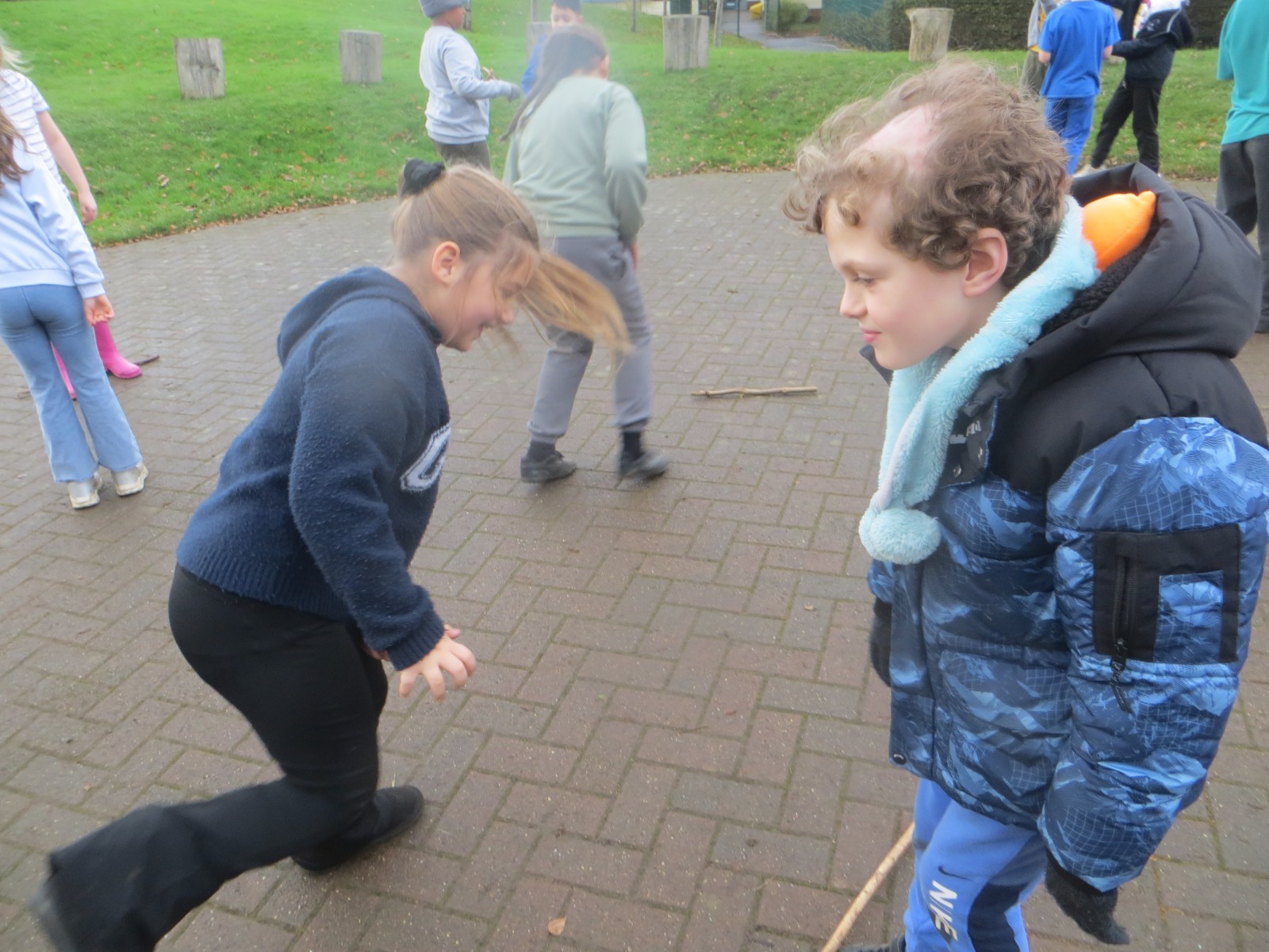Year 4 children continued learning and developing their knowledge of Forest School games this afternoon in. After a quick recap of the importance of playing games and why we need to know and follow the rules of a game, children began by playing a favourite from last time – ‘Fire and Tarps.’ Next, they learnt a new game called ‘Tail Grab.’ Pupils had to each have a tail and move around the designated area in a specific way announced by Mr Gamble – like an elephant, like a mouse for example. When ‘Tail Grab’ was shouted, pupils had ten seconds to grab as many tails as possible – the one with the most tails won! As the game developed, new rules were introduced to make it harder and/or change the game to keep it interesting. Pupils could then choose to play either Ninja Sticks or Stick Toss from last week in pairs, thinking about how they could develop and adapt the game in preparation for developing their own Forest School games in the weeks ahead.
