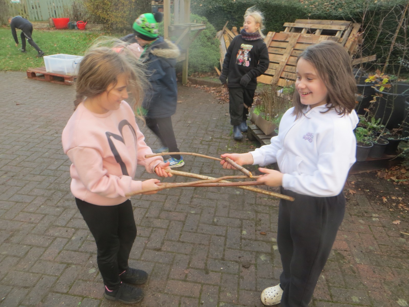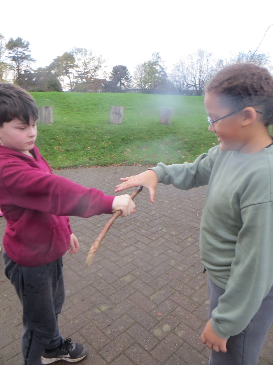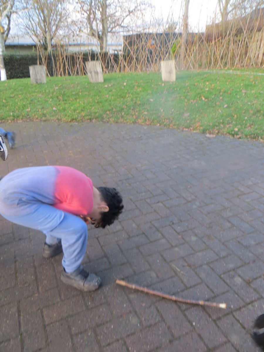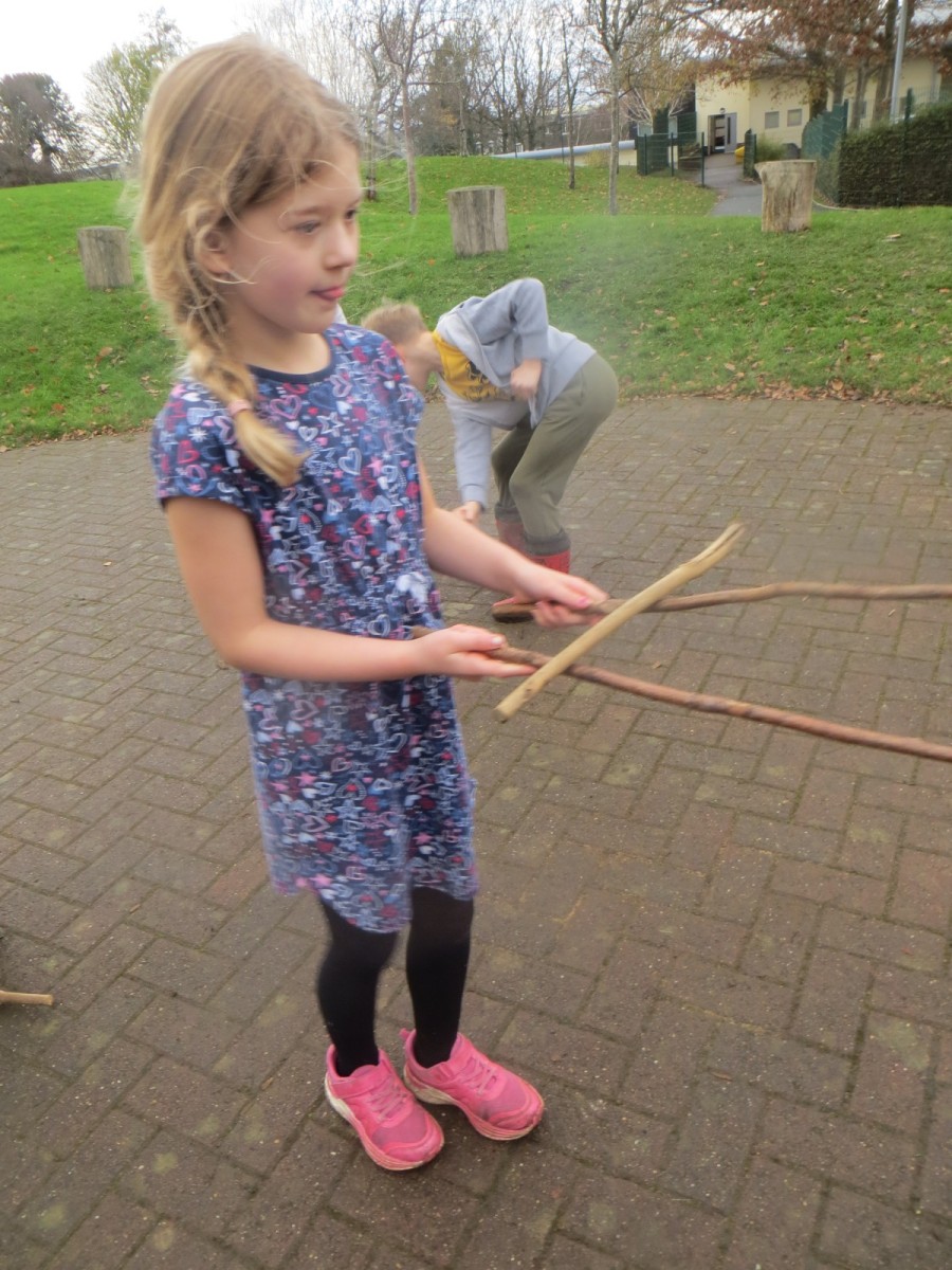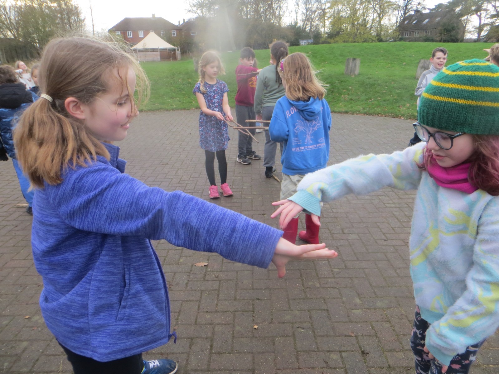 Year 4 children continued learning and developing their knowledge of Forest School games this afternoon in. After a quick recap of the importance of playing games and why we need to know and follow the rules of a game, children began by playing a favourite from last time – ‘Fire and Tarps.’ Next, they learnt a new game called ‘Tail Grab.’ Pupils had to each have a tail and move around the designated area in a specific way announced by Mr Gamble – like an elephant, like a mouse for example. When ‘Tail Grab’ was shouted, pupils had ten seconds to grab as many tails as possible – the one with the most tails won! As the game developed, new rules were introduced to make it harder and/or change the game to keep it interesting. Pupils could then choose to play either Ninja Sticks or Stick Toss from last week in pairs, thinking about how they could develop and adapt the game in preparation for developing their own Forest School games in the weeks ahead.