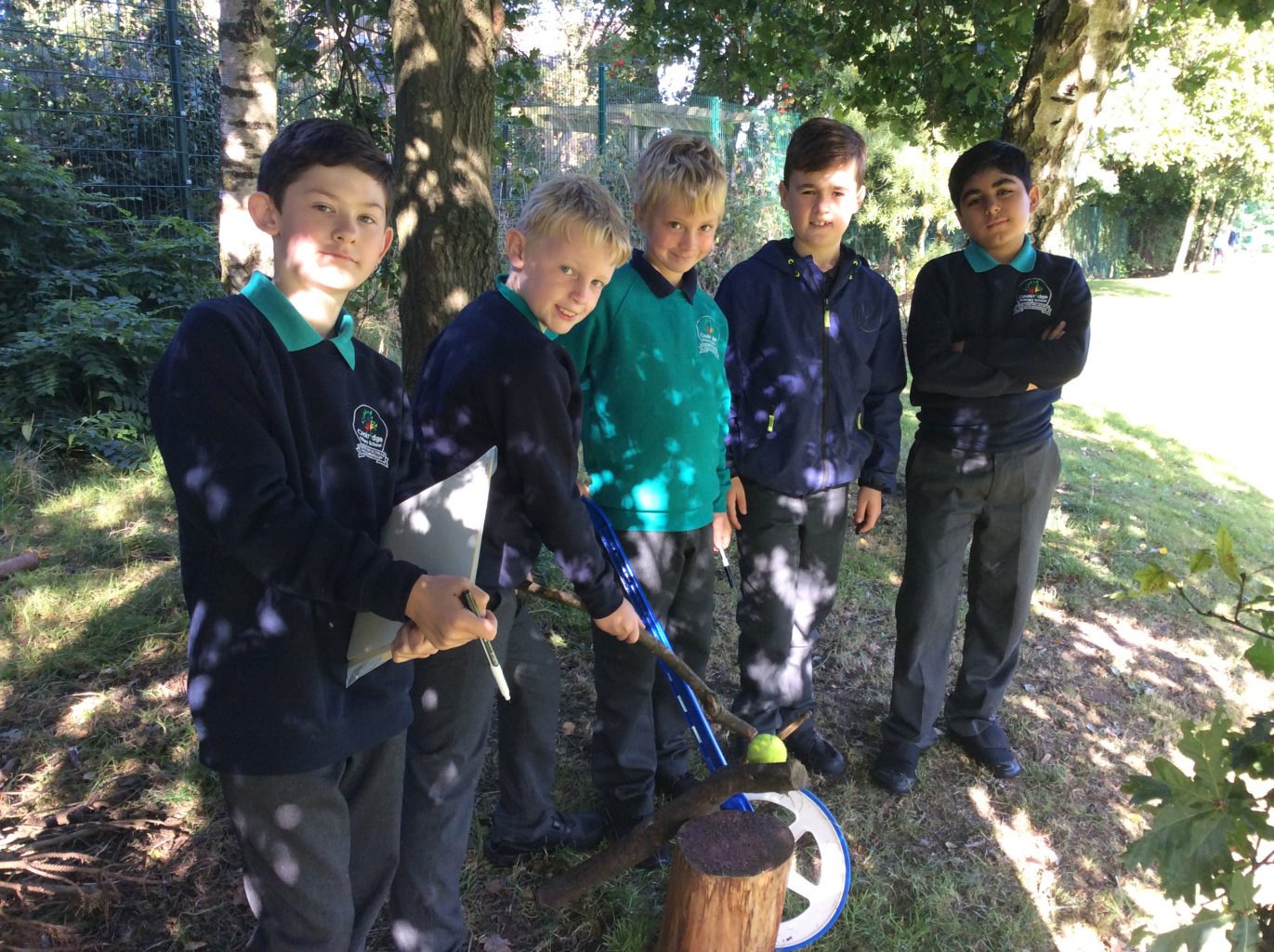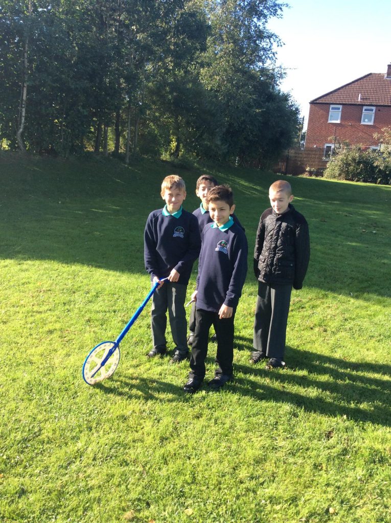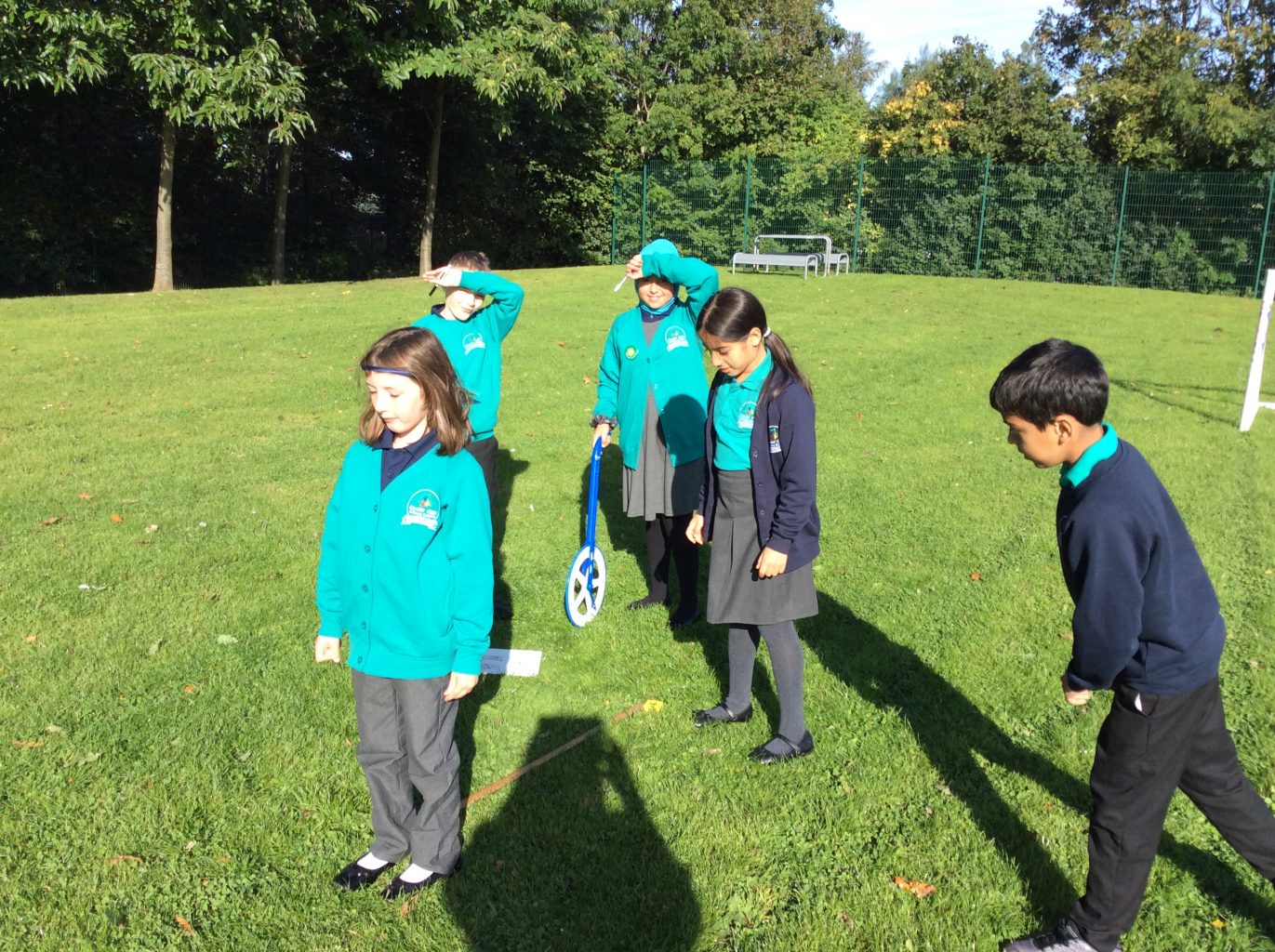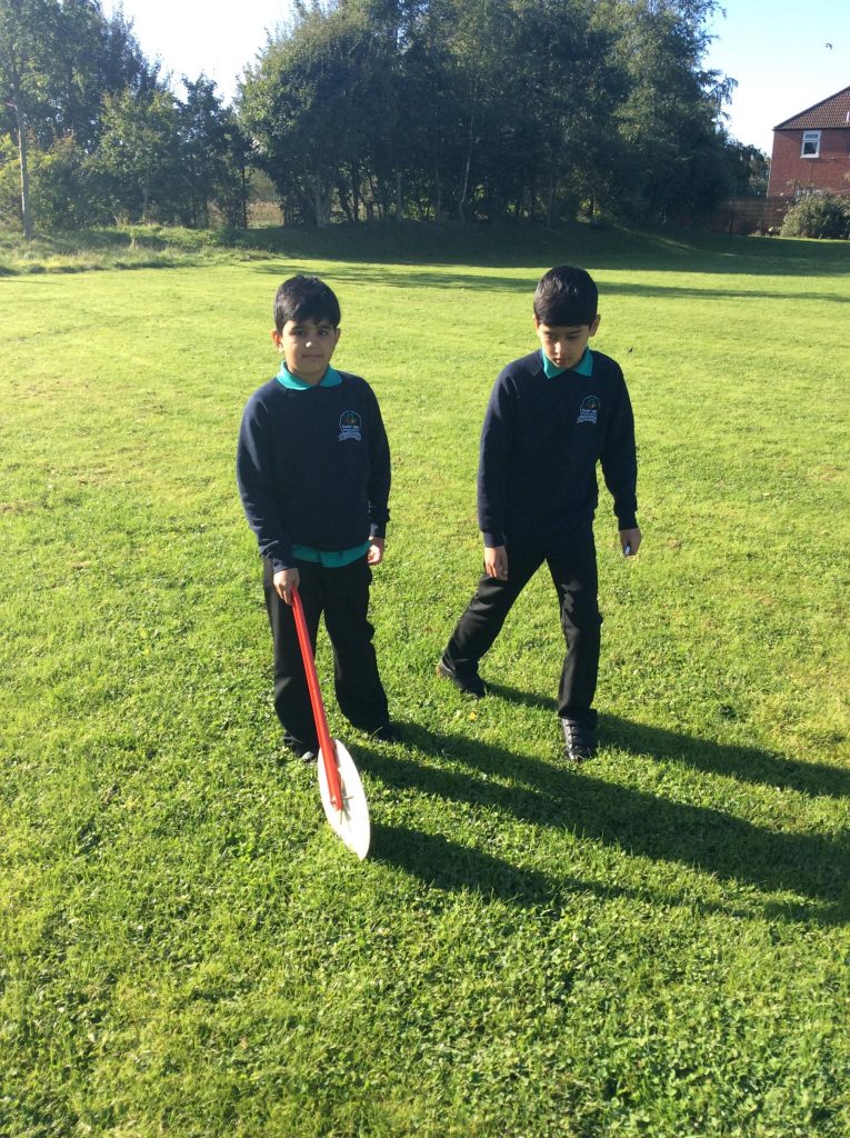 This week in maths, UKS2 were asked to work in small groups and use measuring equipment to develop a fun activity that would show they understood measure. The activity explored finding the perimeter and area of a shape or converting measurements. Each group was shown how to use the different pieces of equipment and had a white board and pen for working out. All the groups came up with a fun and exciting activity, including: measuring throwing distance, measuring the height of trees and calculating the area of the football pitch. One team even managed to create a catapult to throw apples!
