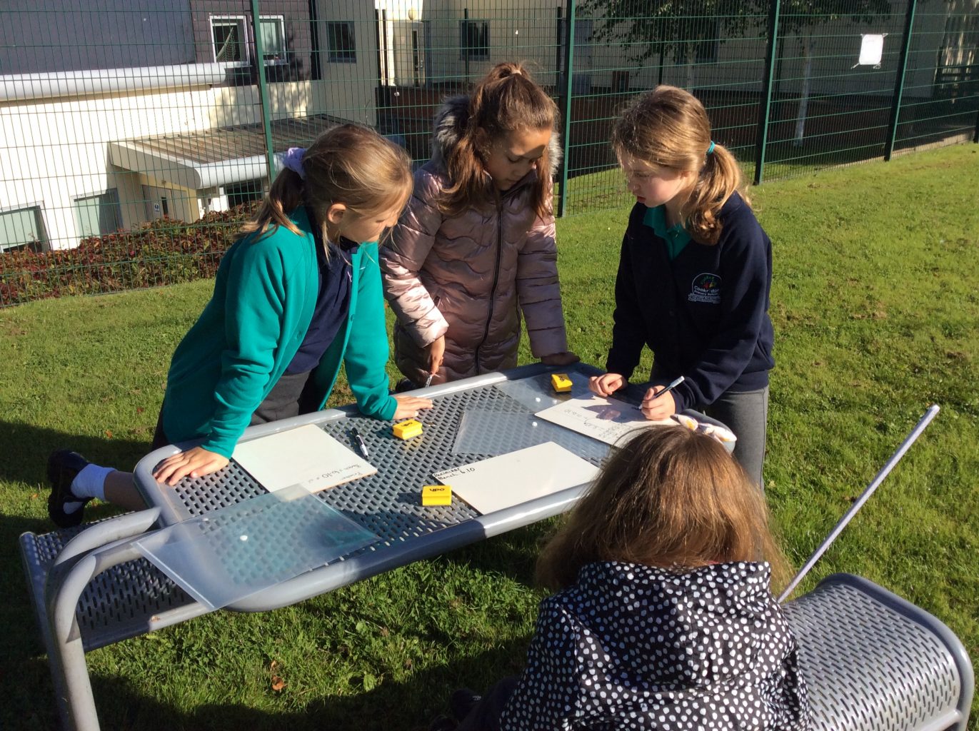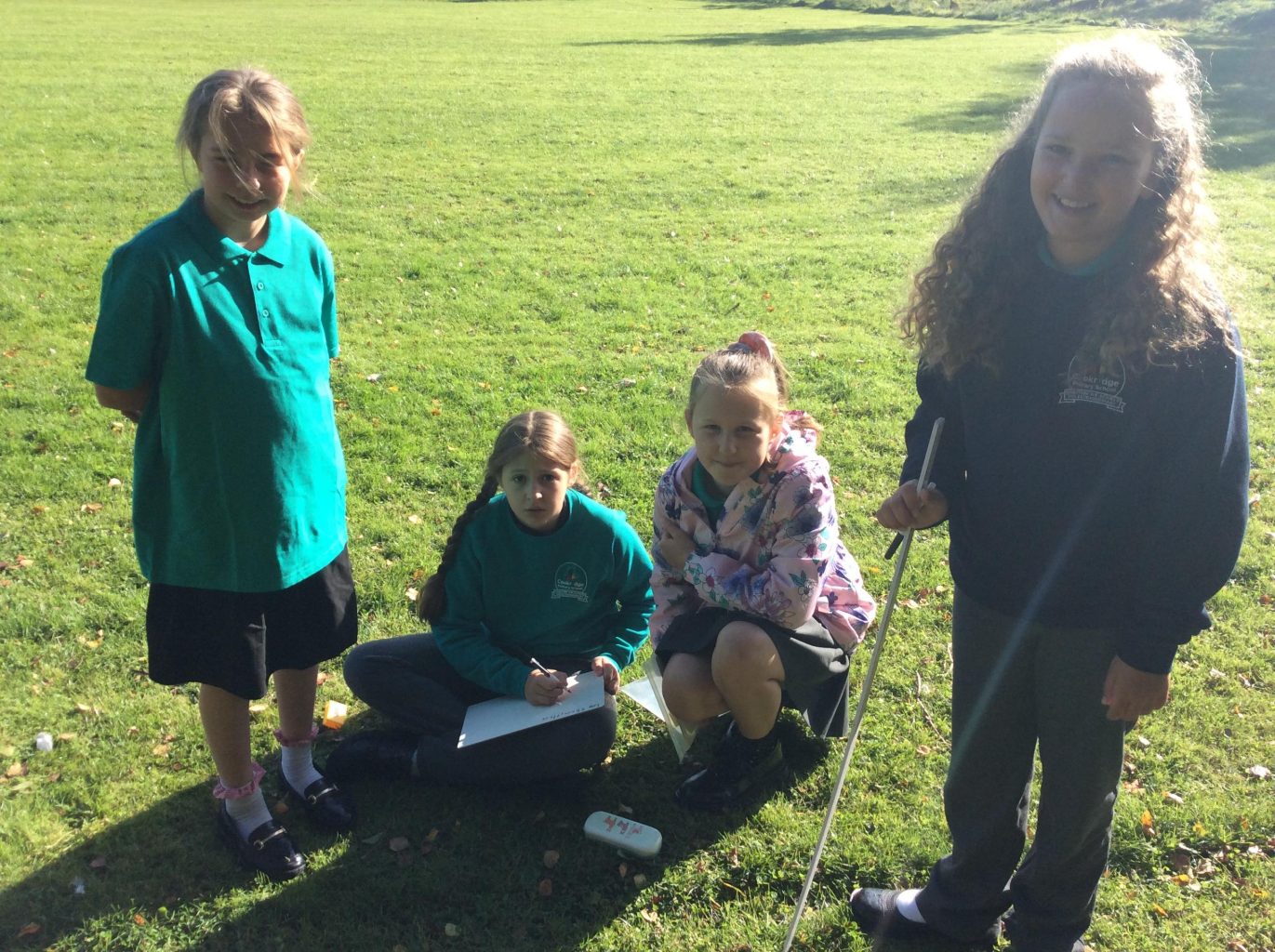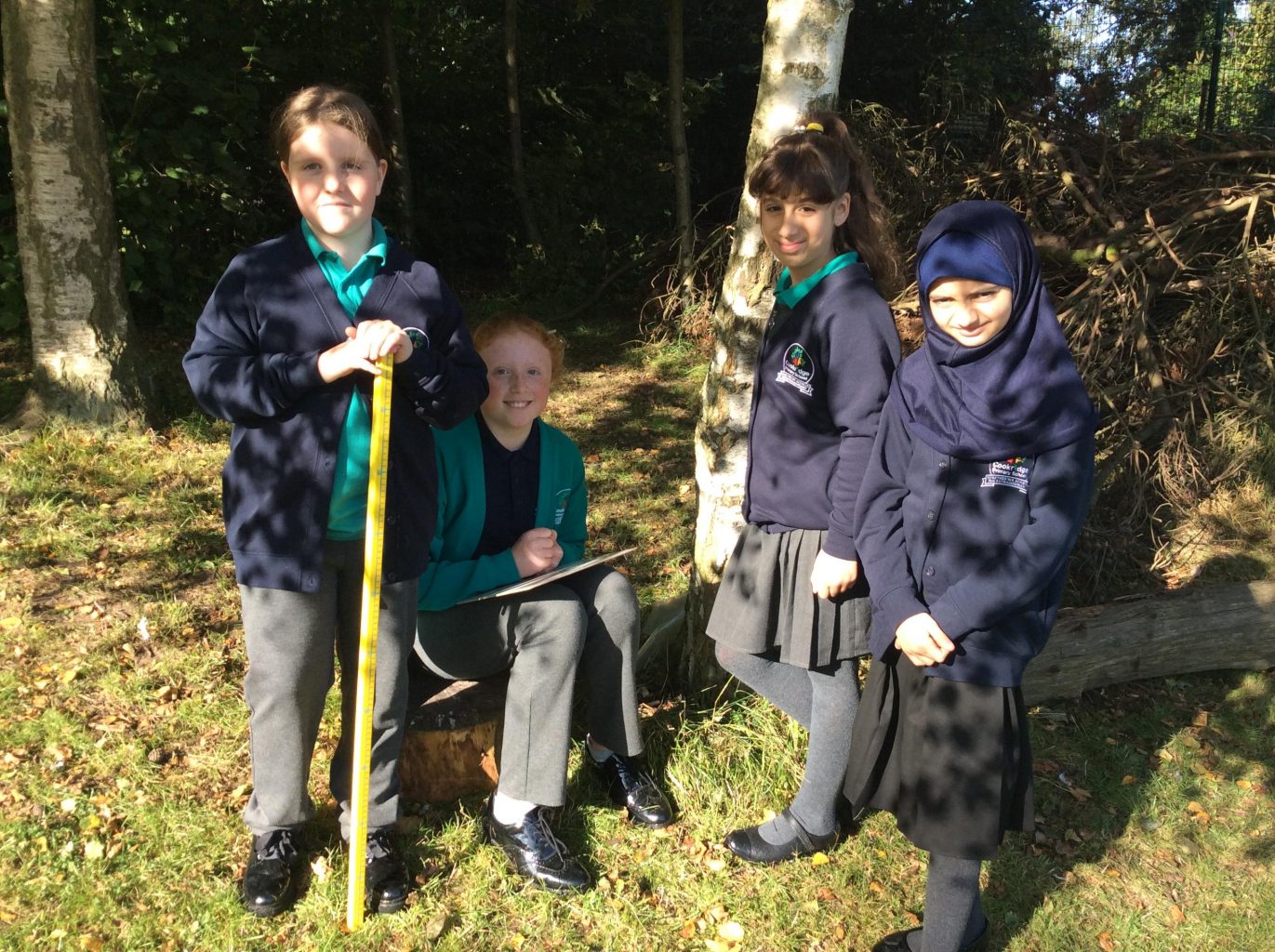 This week in maths, UKS2 were asked to work in small groups and use measuring equipment to develop a fun activity that would show they understood measure. The activity explored finding the perimeter and area of a shape or converting measurements. Each group was shown how to use the different pieces of equipment and had a white board and pen for working out. All the groups came up with a fun and exciting activity, including: measuring throwing distance, measuring the height of trees and calculating the area of the football pitch. One team even managed to create a catapult to throw apples!