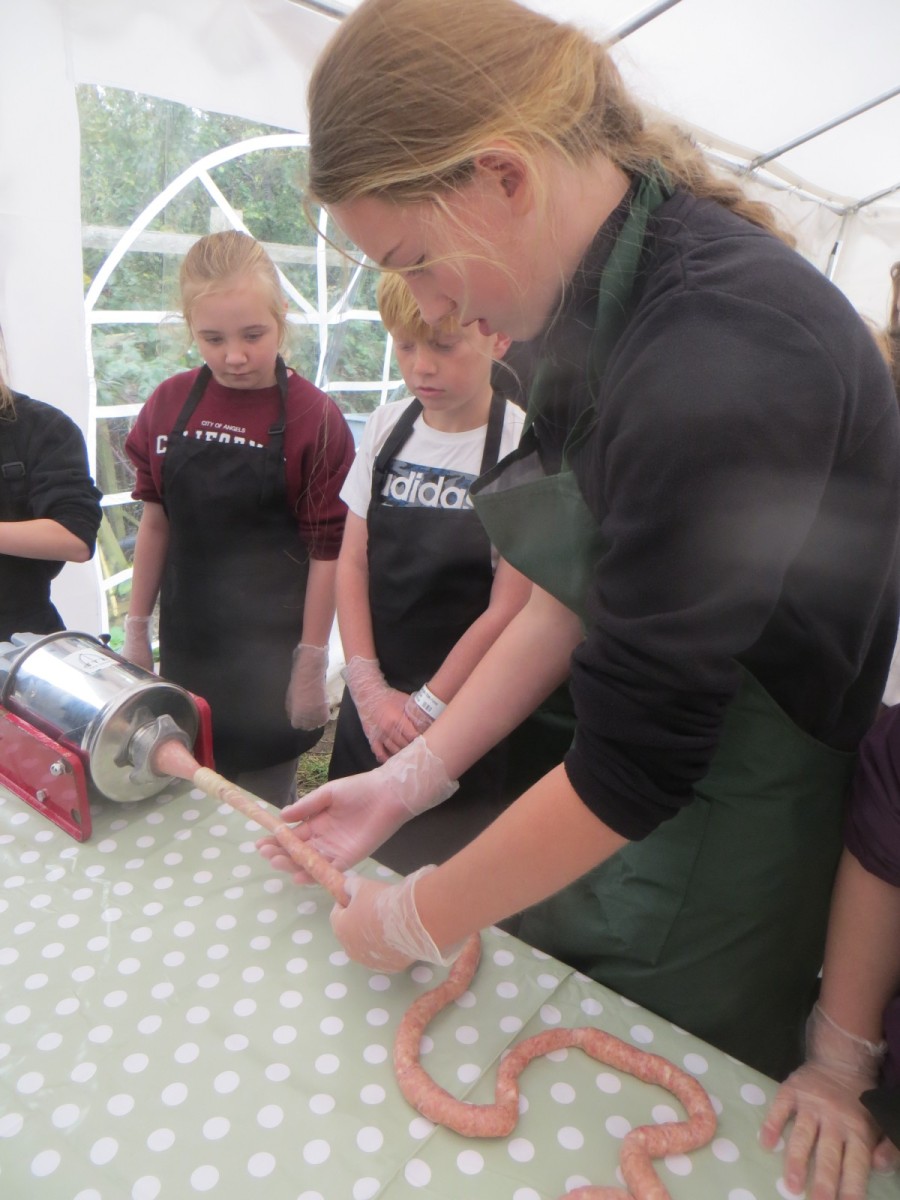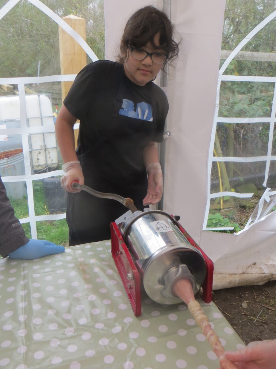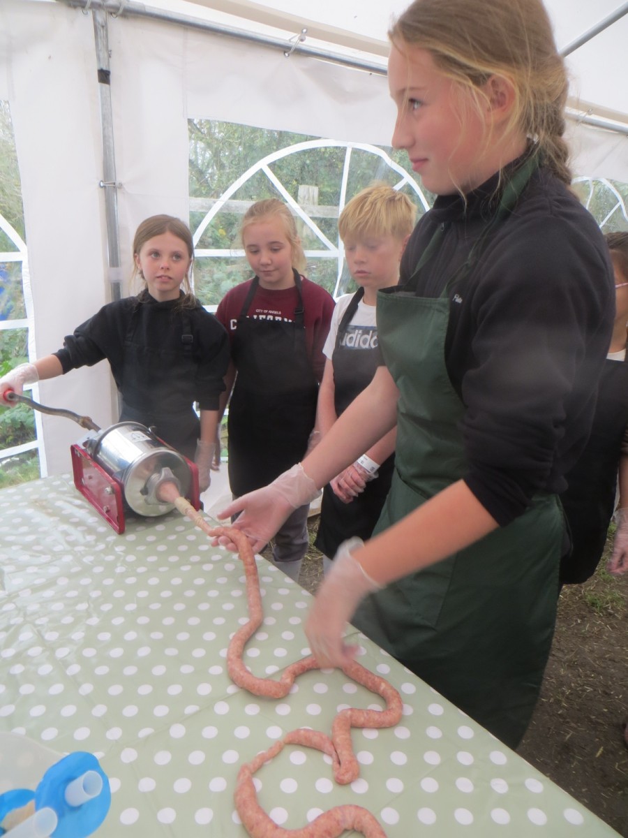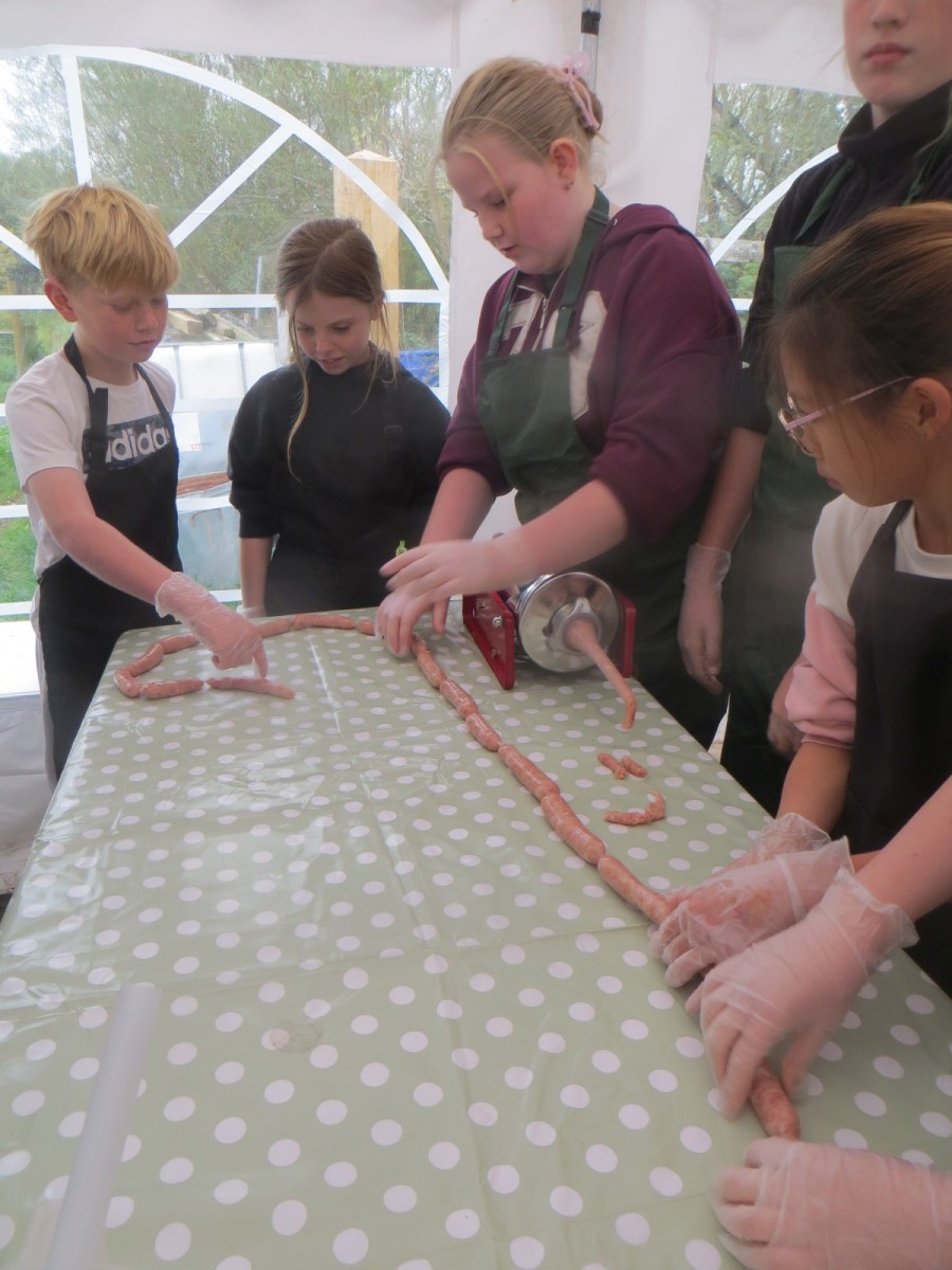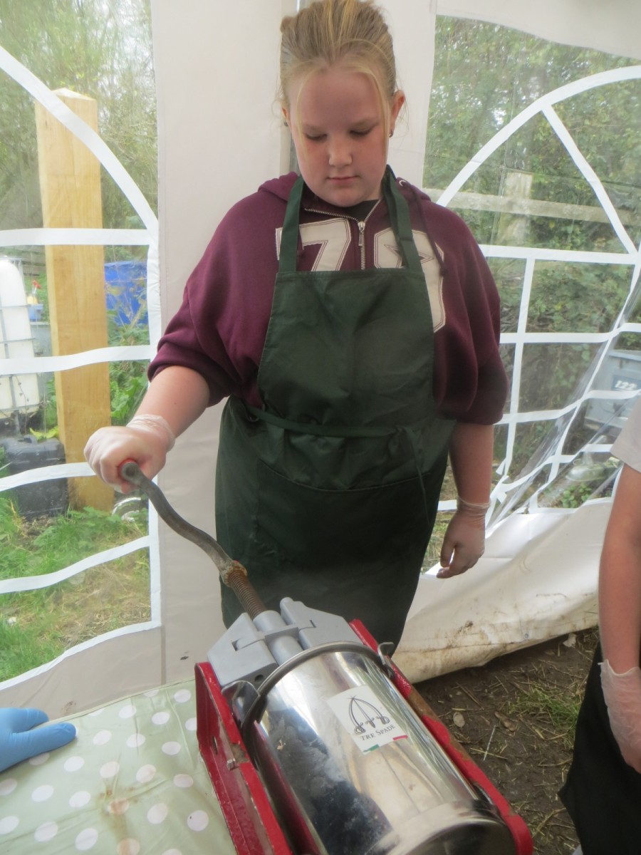 Today marked the end of Year 6’s visits to Little Beck Farm this Autumn and Group 3 thoroughly loved their day on this smallholding near Masham. A BIG thank you to Farmer ROwan for hosting us over the six days over the past month – she is such an inspiration for the pupils and provides experiences which create life-long memories. Children used apples from the orchard to help Farmer Rowan feed her pigs and learnt all about how she selects which ones to breed, fatten up or sell as well as collecting and learning all about chicken eggs! After that, children visited the farm orchard where they picked a variety of apples and pears including conference, bramley, golden delicious and pippin in order to make fresh fruit juice. In the outdoor classroom, we then chopped, de-seeded, milled and filtered the pulp before tasting the produce which we made. After lunch, children then became butchers and made their own sausages to bring back to school and cook at the fire pit in a future Forest School. Children learnt about the different cuts of meat from a pig and minced them using a machine. It was really tricky to mix in all the ingredients and children got stuck in with their hands to blend them all together – we even substituted some of the water for the apple juice made earlier – so we will taste the difference when it comes to eating! Next, children got to feed the sausage meat into a filling machine and turned the handle to fill the casings, whilst trying to keep them evenly sized. The final part was learning how to twist the casings to create sausages – well done Group 3!