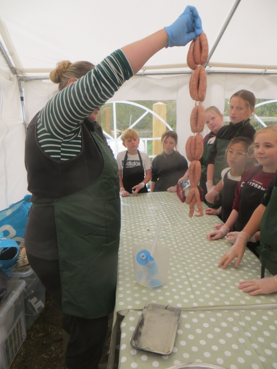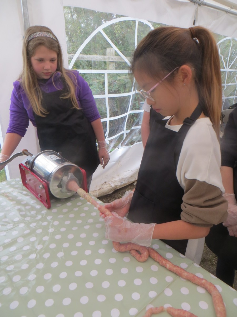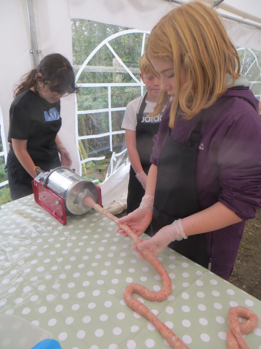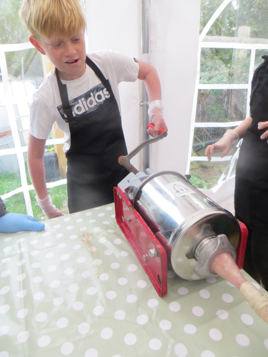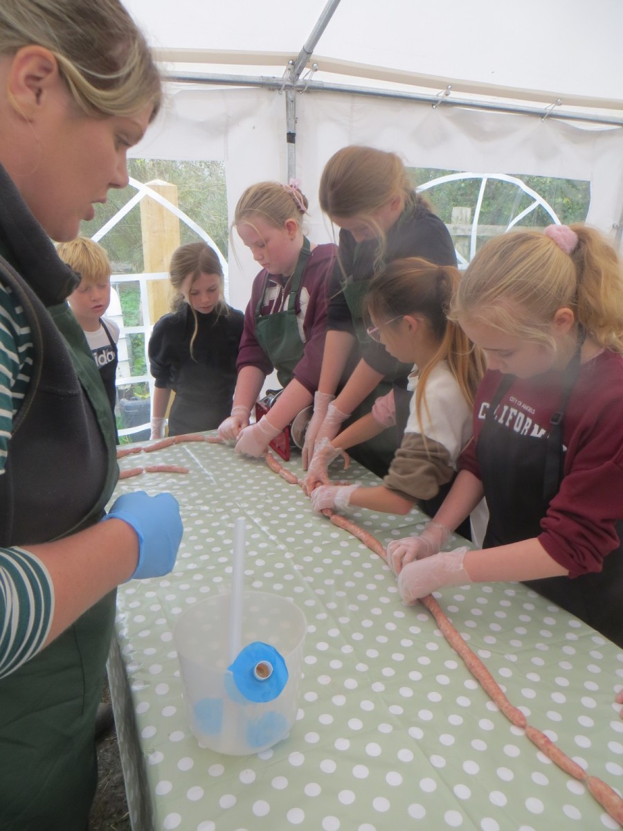 Today marked the end of Year 6’s visits to Little Beck Farm this Autumn and Group 3 thoroughly loved their day on this smallholding near Masham. A BIG thank you to Farmer ROwan for hosting us over the six days over the past month – she is such an inspiration for the pupils and provides experiences which create life-long memories. Children used apples from the orchard to help Farmer Rowan feed her pigs and learnt all about how she selects which ones to breed, fatten up or sell as well as collecting and learning all about chicken eggs! After that, children visited the farm orchard where they picked a variety of apples and pears including conference, bramley, golden delicious and pippin in order to make fresh fruit juice. In the outdoor classroom, we then chopped, de-seeded, milled and filtered the pulp before tasting the produce which we made. After lunch, children then became butchers and made their own sausages to bring back to school and cook at the fire pit in a future Forest School. Children learnt about the different cuts of meat from a pig and minced them using a machine. It was really tricky to mix in all the ingredients and children got stuck in with their hands to blend them all together – we even substituted some of the water for the apple juice made earlier – so we will taste the difference when it comes to eating! Next, children got to feed the sausage meat into a filling machine and turned the handle to fill the casings, whilst trying to keep them evenly sized. The final part was learning how to twist the casings to create sausages – well done Group 3!