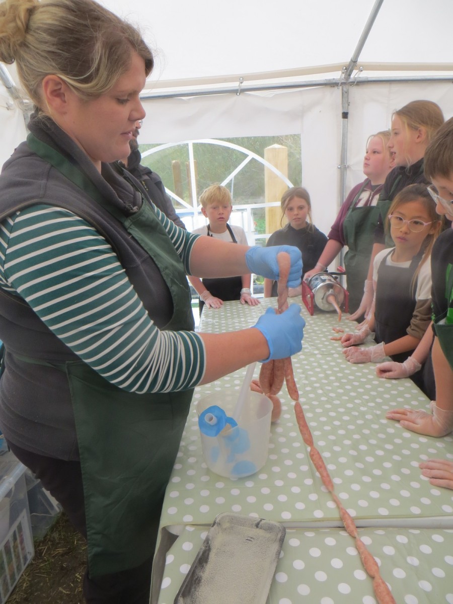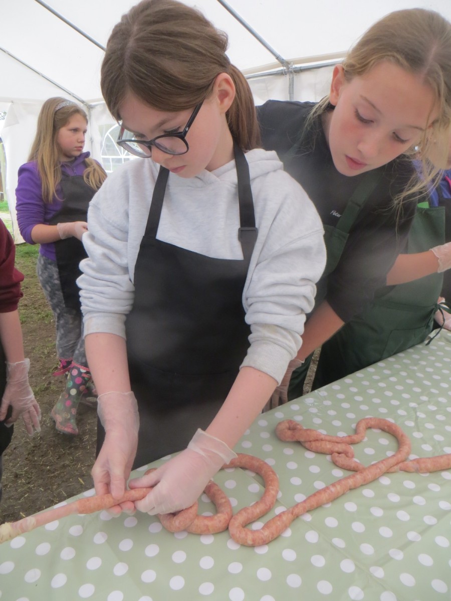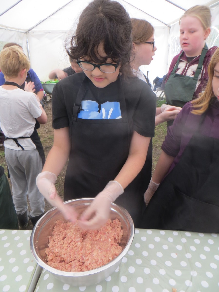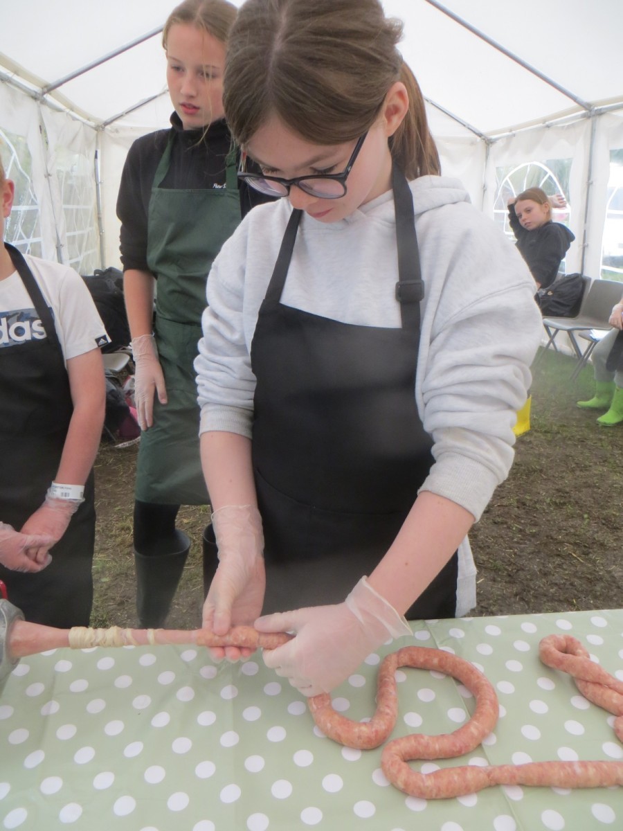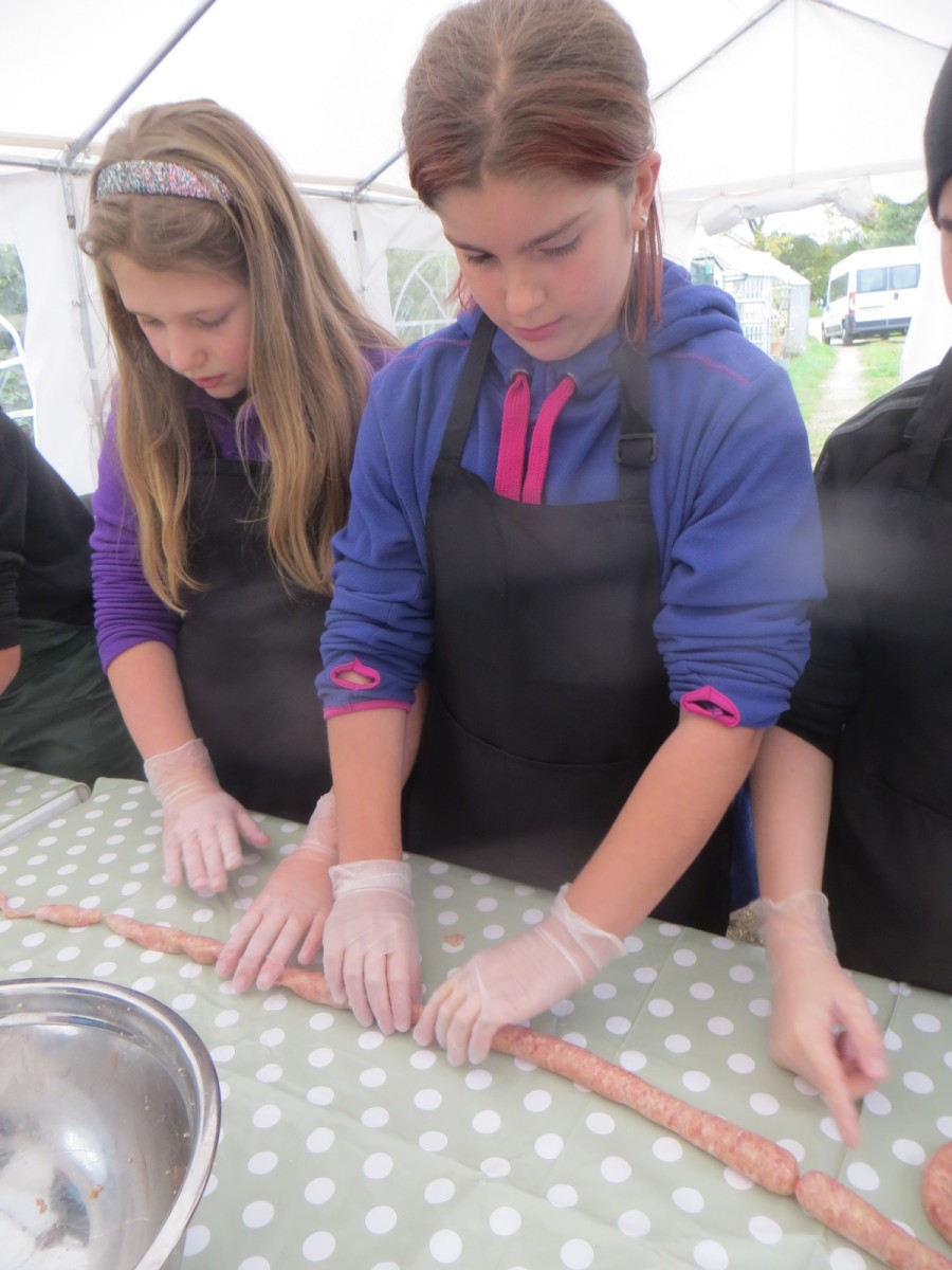 Today marked the end of Year 6’s visits to Little Beck Farm this Autumn and Group 3 thoroughly loved their day on this smallholding near Masham. A BIG thank you to Farmer ROwan for hosting us over the six days over the past month – she is such an inspiration for the pupils and provides experiences which create life-long memories. Children used apples from the orchard to help Farmer Rowan feed her pigs and learnt all about how she selects which ones to breed, fatten up or sell as well as collecting and learning all about chicken eggs! After that, children visited the farm orchard where they picked a variety of apples and pears including conference, bramley, golden delicious and pippin in order to make fresh fruit juice. In the outdoor classroom, we then chopped, de-seeded, milled and filtered the pulp before tasting the produce which we made. After lunch, children then became butchers and made their own sausages to bring back to school and cook at the fire pit in a future Forest School. Children learnt about the different cuts of meat from a pig and minced them using a machine. It was really tricky to mix in all the ingredients and children got stuck in with their hands to blend them all together – we even substituted some of the water for the apple juice made earlier – so we will taste the difference when it comes to eating! Next, children got to feed the sausage meat into a filling machine and turned the handle to fill the casings, whilst trying to keep them evenly sized. The final part was learning how to twist the casings to create sausages – well done Group 3!