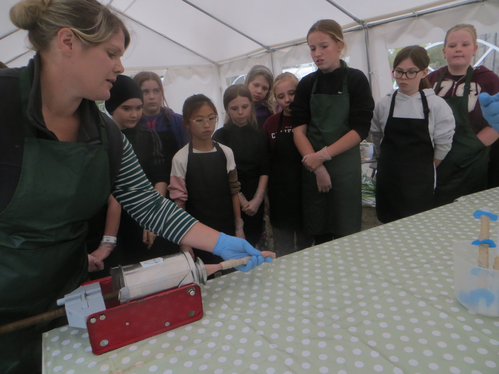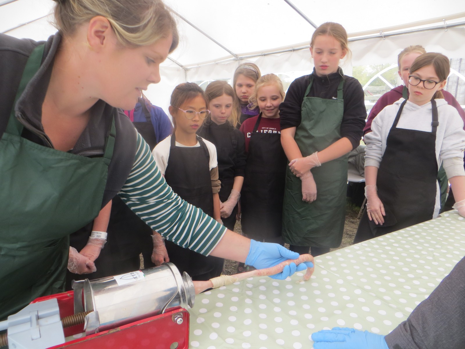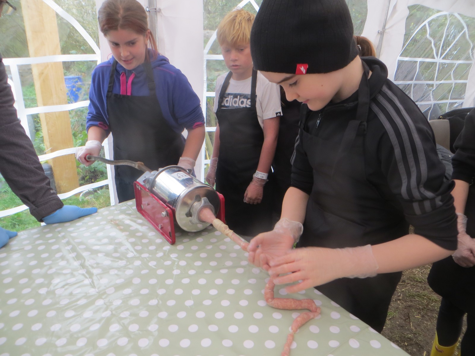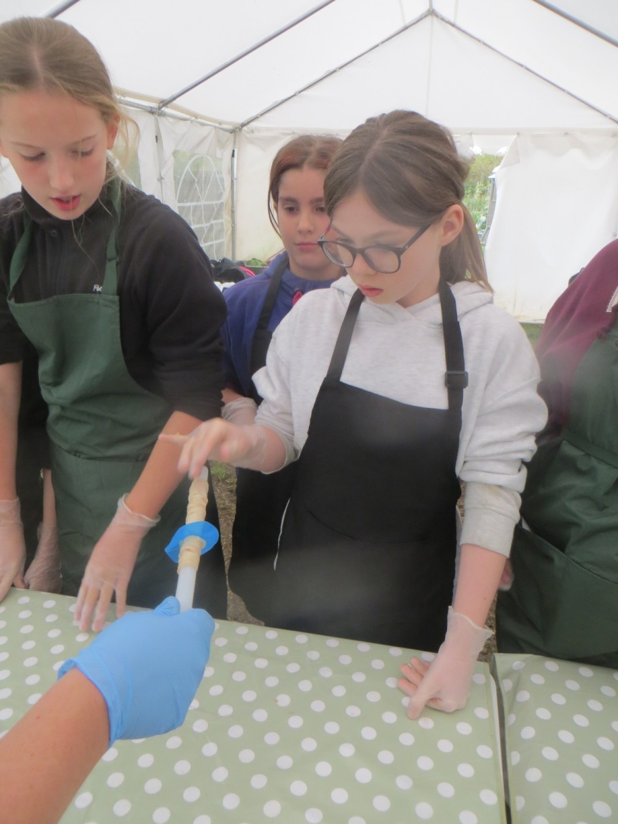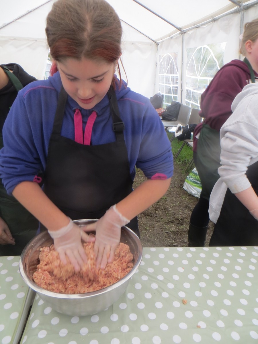 Today marked the end of Year 6’s visits to Little Beck Farm this Autumn and Group 3 thoroughly loved their day on this smallholding near Masham. A BIG thank you to Farmer ROwan for hosting us over the six days over the past month – she is such an inspiration for the pupils and provides experiences which create life-long memories. Children used apples from the orchard to help Farmer Rowan feed her pigs and learnt all about how she selects which ones to breed, fatten up or sell as well as collecting and learning all about chicken eggs! After that, children visited the farm orchard where they picked a variety of apples and pears including conference, bramley, golden delicious and pippin in order to make fresh fruit juice. In the outdoor classroom, we then chopped, de-seeded, milled and filtered the pulp before tasting the produce which we made. After lunch, children then became butchers and made their own sausages to bring back to school and cook at the fire pit in a future Forest School. Children learnt about the different cuts of meat from a pig and minced them using a machine. It was really tricky to mix in all the ingredients and children got stuck in with their hands to blend them all together – we even substituted some of the water for the apple juice made earlier – so we will taste the difference when it comes to eating! Next, children got to feed the sausage meat into a filling machine and turned the handle to fill the casings, whilst trying to keep them evenly sized. The final part was learning how to twist the casings to create sausages – well done Group 3!