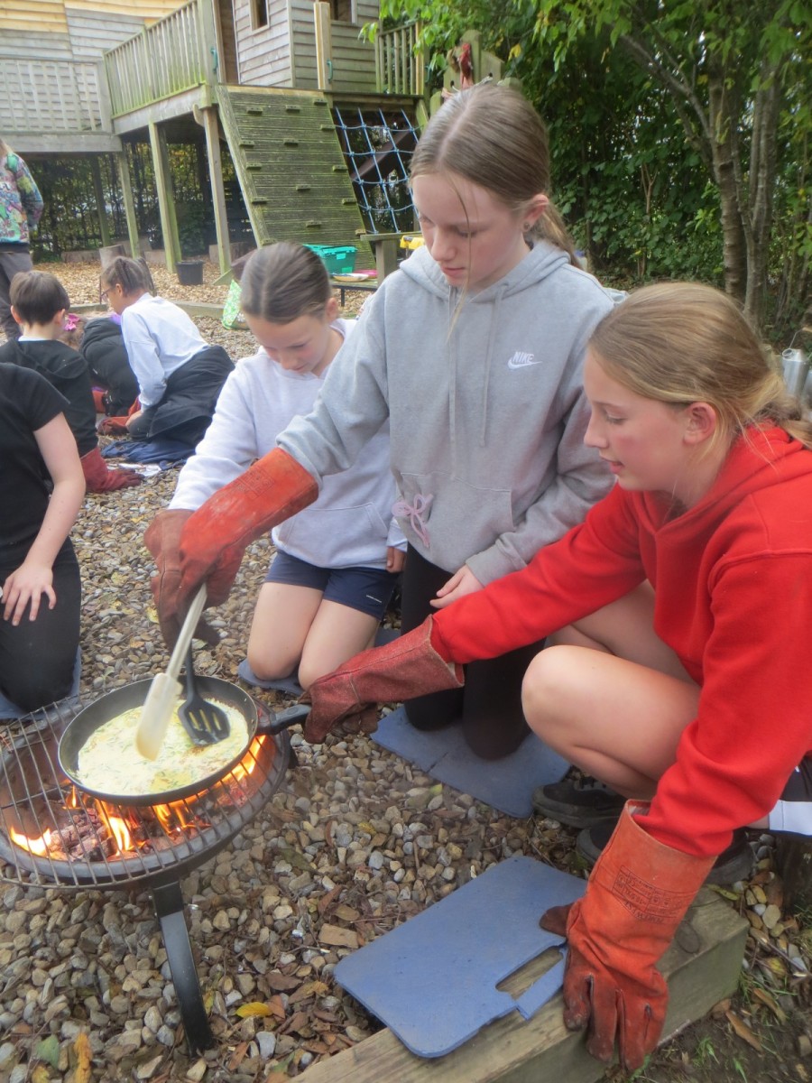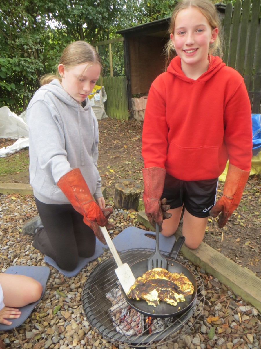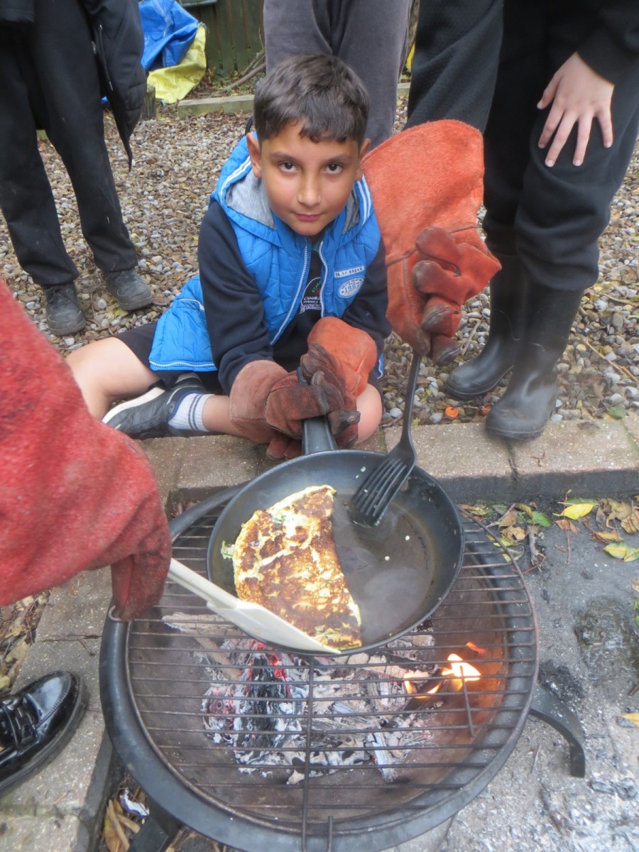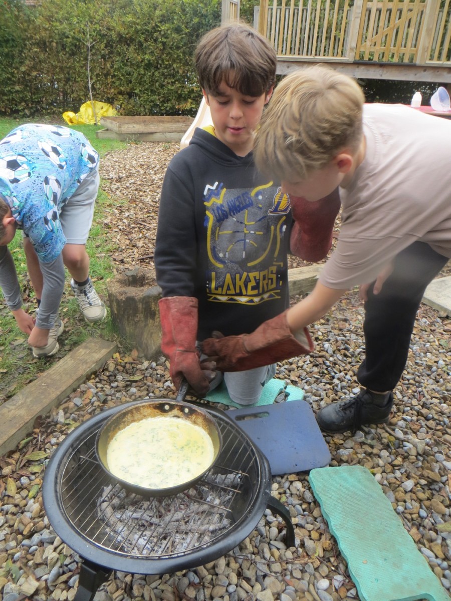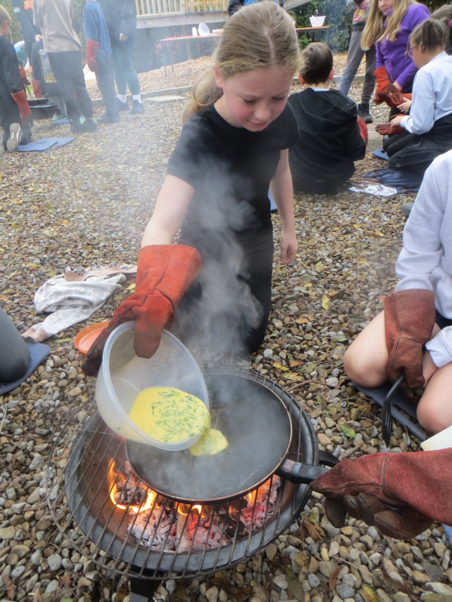 The Year 6 pupils loved their second session of outdoor cooking by creating omelettes. After collecting three chicken eggs per team, pupils explored the herb garden for ingredients. Whilst foraging, children tested the flavours by rubbing the leaves in-between their fingers and taste testing some of the leaves from various herbs. After settling on their desired flavours, children picked from sage, rosemary, oregano, thyme, chives and lemon mint. The eggs were then cracked and emptied into a bowl with the herbs and some added milk and whisked together. Pupils also used bill hooks to split pieces of kindling for the fires. The mixtures were then cooked over fire pits carefully before being enjoyed by all. As we ate, we discussed the importance of sourcing environmentally friendly food and began to think about where our food comes from and the carbon footprint it creates. We also worked out our omelettes cost a total of 15p each – a bargain meal in the current climate!