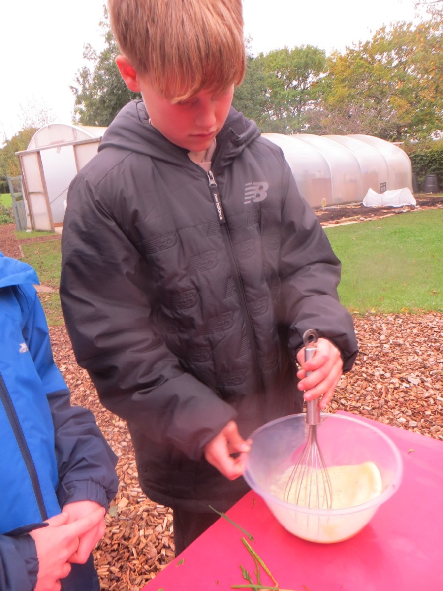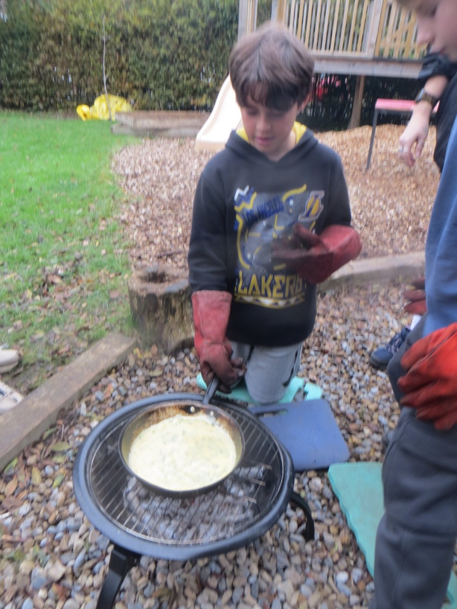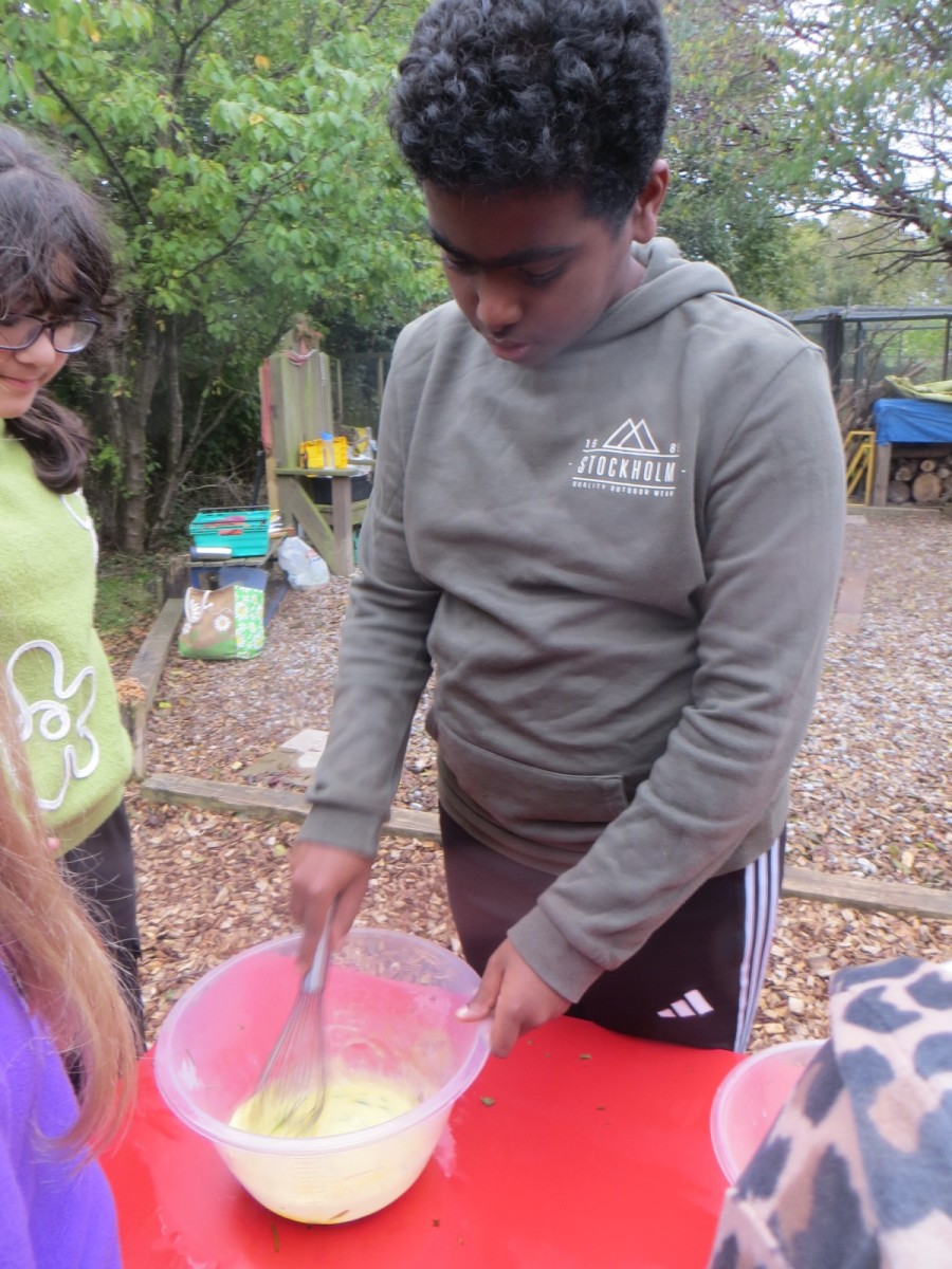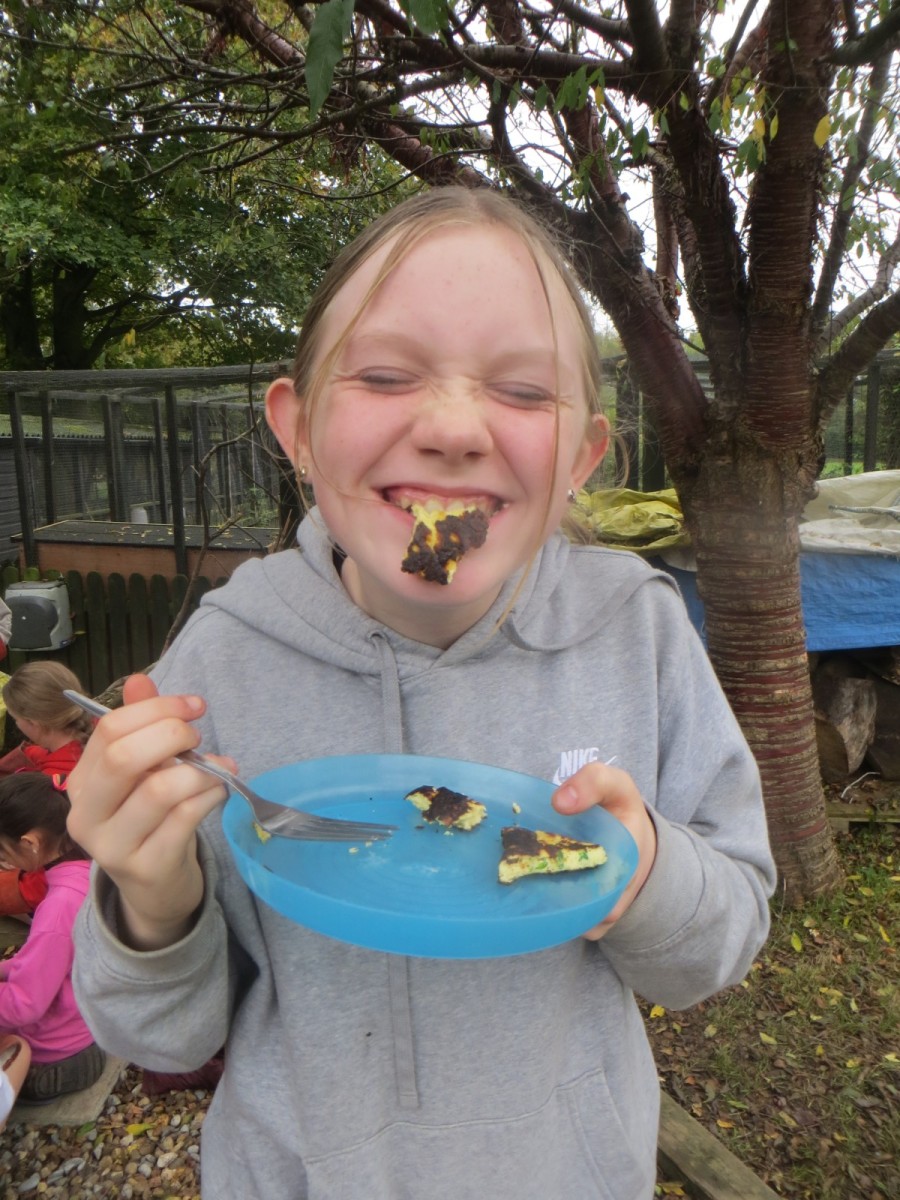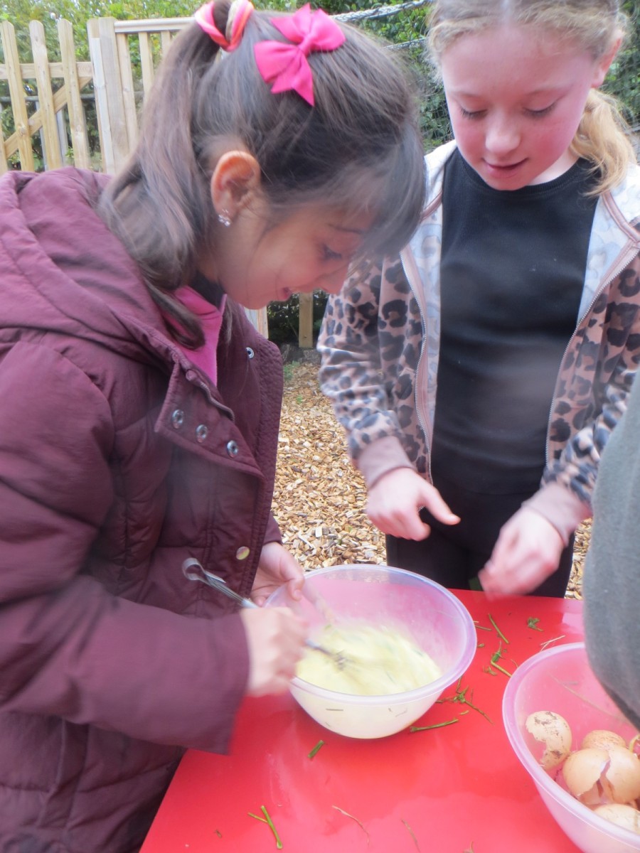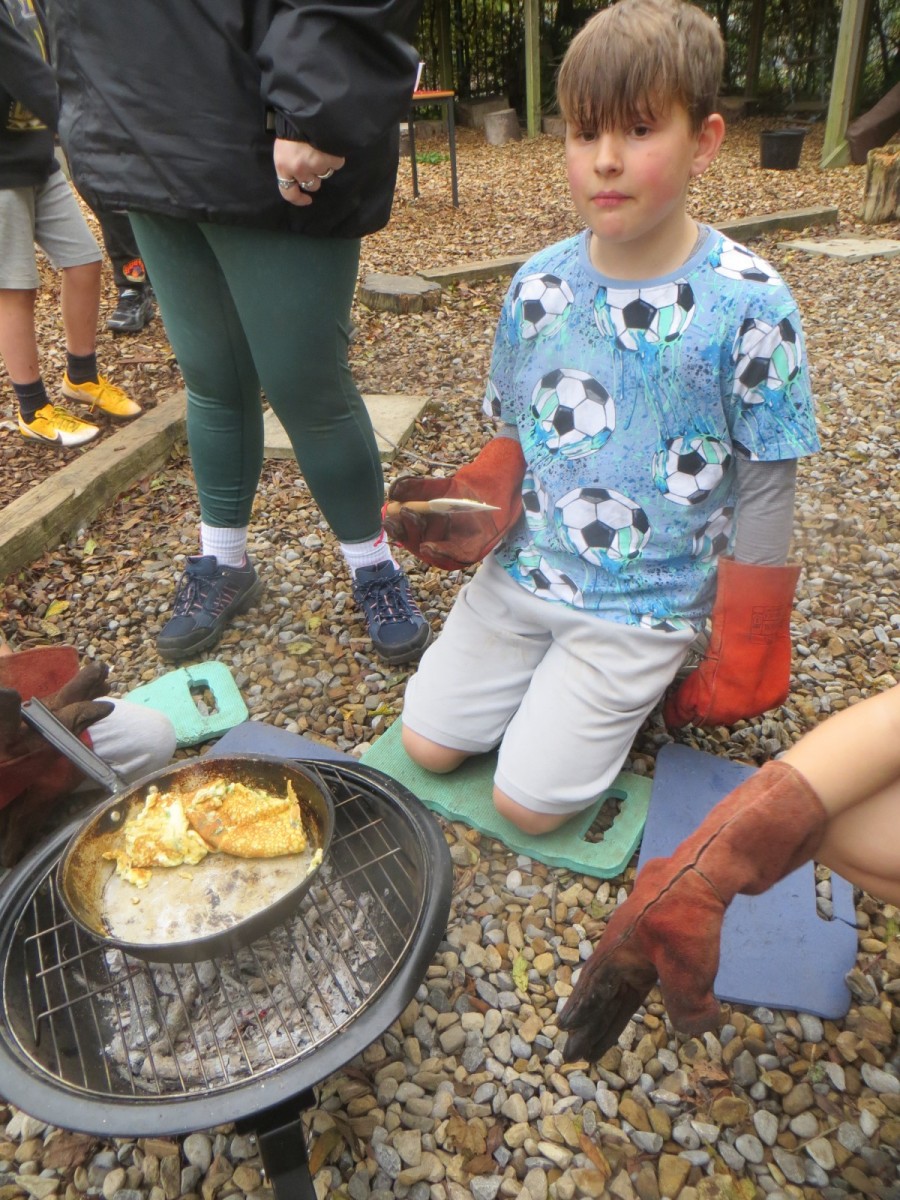 The Year 6 pupils loved their second session of outdoor cooking by creating omelettes. After collecting three chicken eggs per team, pupils explored the herb garden for ingredients. Whilst foraging, children tested the flavours by rubbing the leaves in-between their fingers and taste testing some of the leaves from various herbs. After settling on their desired flavours, children picked from sage, rosemary, oregano, thyme, chives and lemon mint. The eggs were then cracked and emptied into a bowl with the herbs and some added milk and whisked together. Pupils also used bill hooks to split pieces of kindling for the fires. The mixtures were then cooked over fire pits carefully before being enjoyed by all. As we ate, we discussed the importance of sourcing environmentally friendly food and began to think about where our food comes from and the carbon footprint it creates. We also worked out our omelettes cost a total of 15p each – a bargain meal in the current climate!