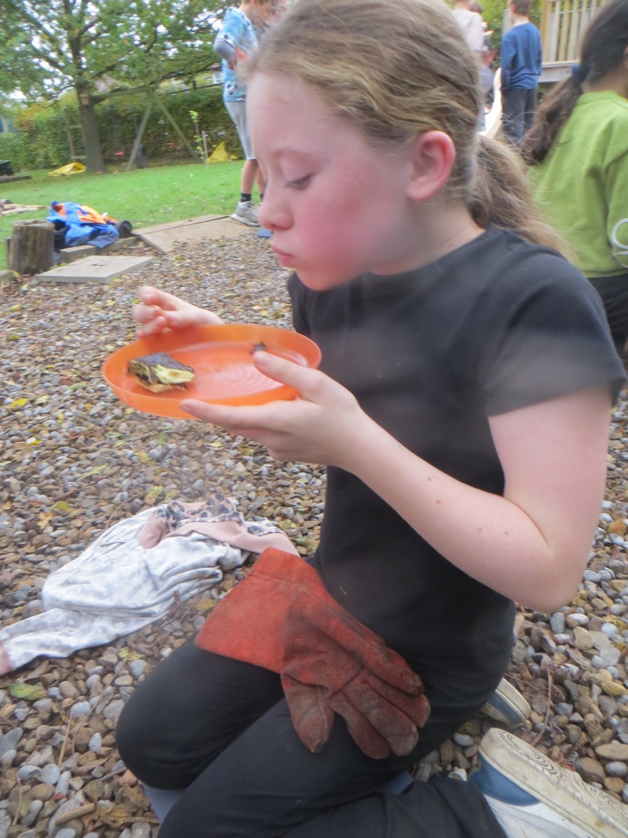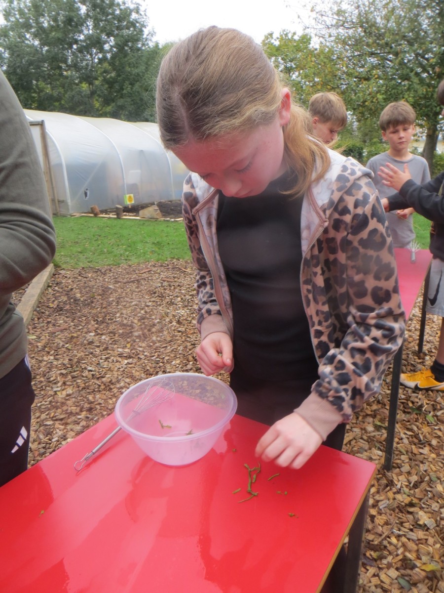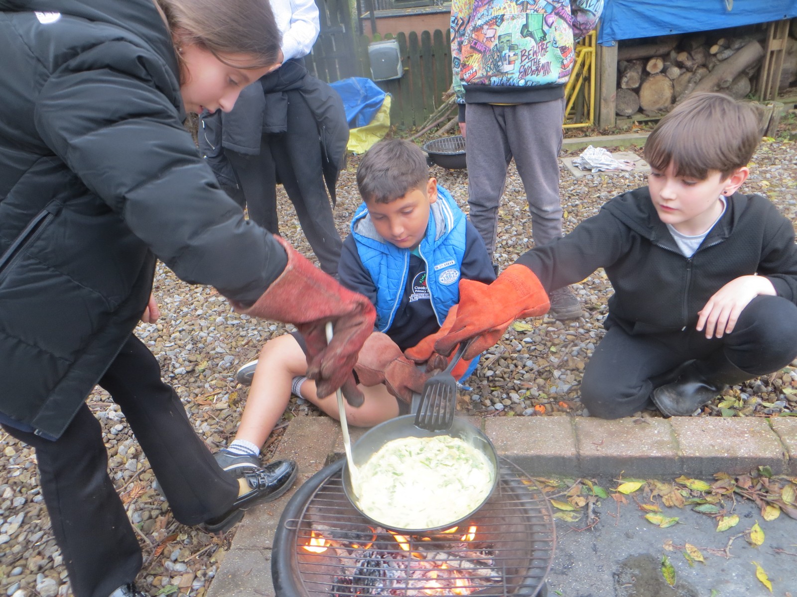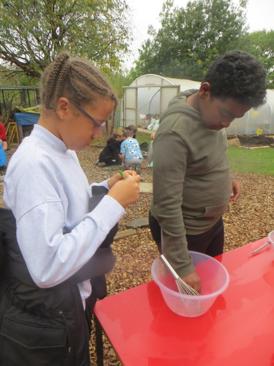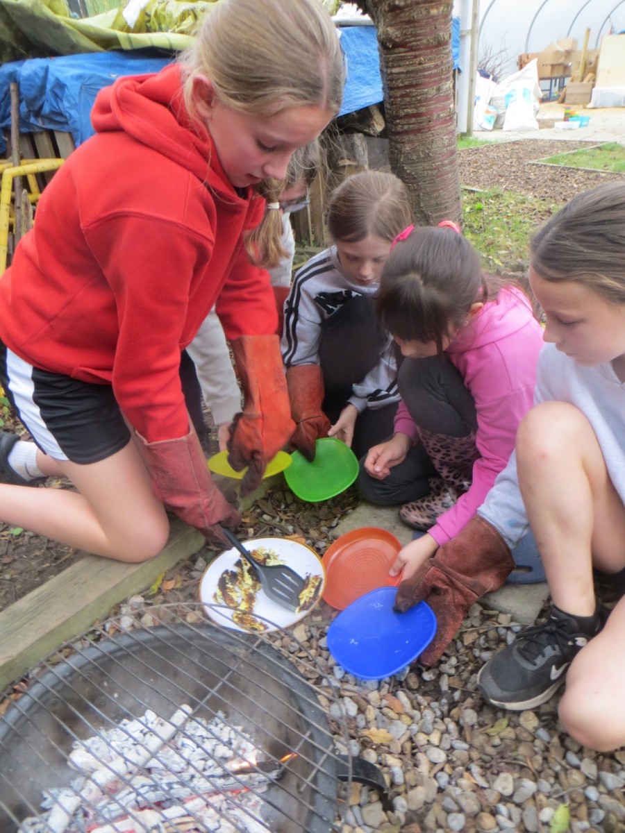 The Year 6 pupils loved their second session of outdoor cooking by creating omelettes. After collecting three chicken eggs per team, pupils explored the herb garden for ingredients. Whilst foraging, children tested the flavours by rubbing the leaves in-between their fingers and taste testing some of the leaves from various herbs. After settling on their desired flavours, children picked from sage, rosemary, oregano, thyme, chives and lemon mint. The eggs were then cracked and emptied into a bowl with the herbs and some added milk and whisked together. Pupils also used bill hooks to split pieces of kindling for the fires. The mixtures were then cooked over fire pits carefully before being enjoyed by all. As we ate, we discussed the importance of sourcing environmentally friendly food and began to think about where our food comes from and the carbon footprint it creates. We also worked out our omelettes cost a total of 15p each – a bargain meal in the current climate!
